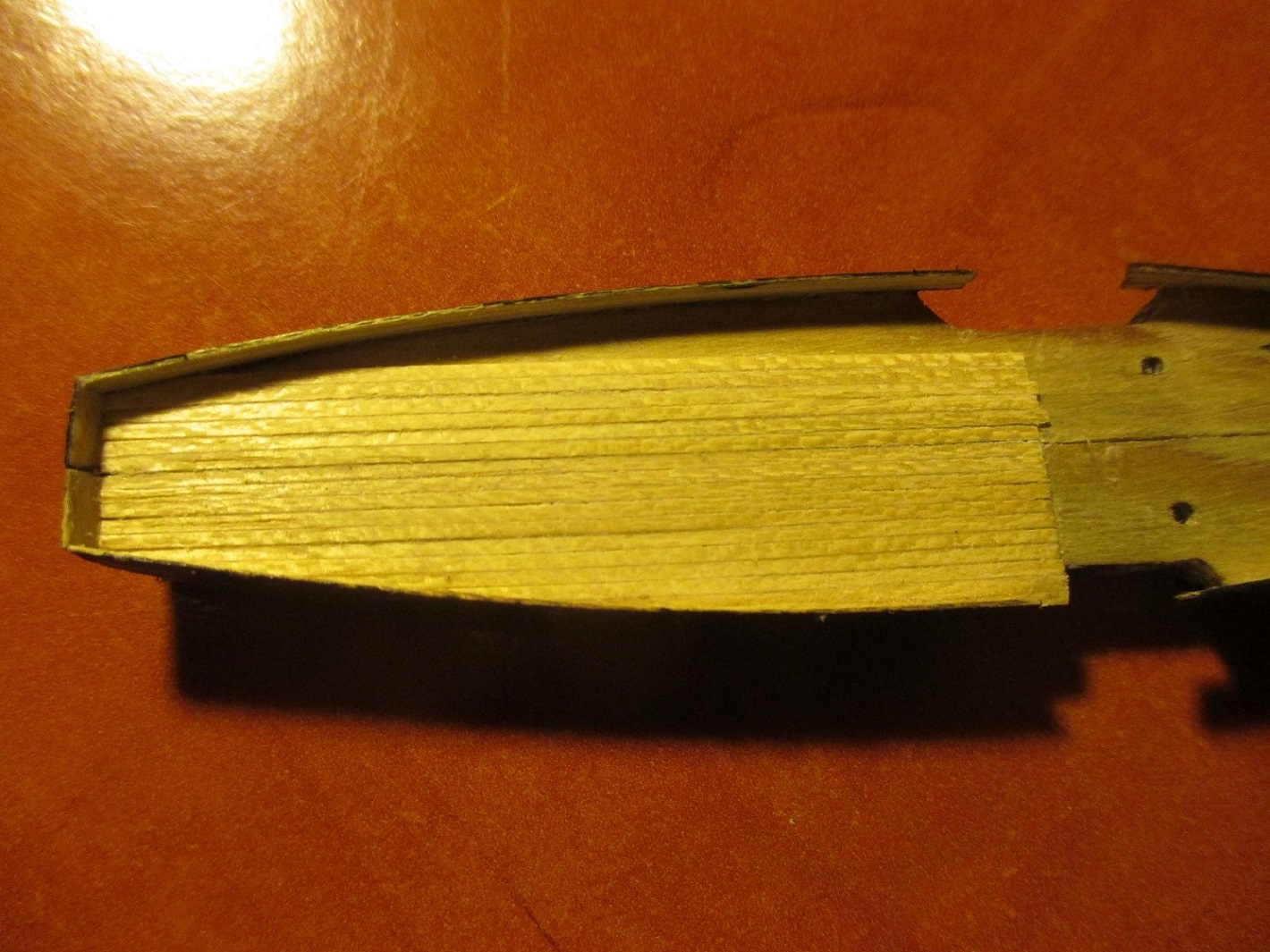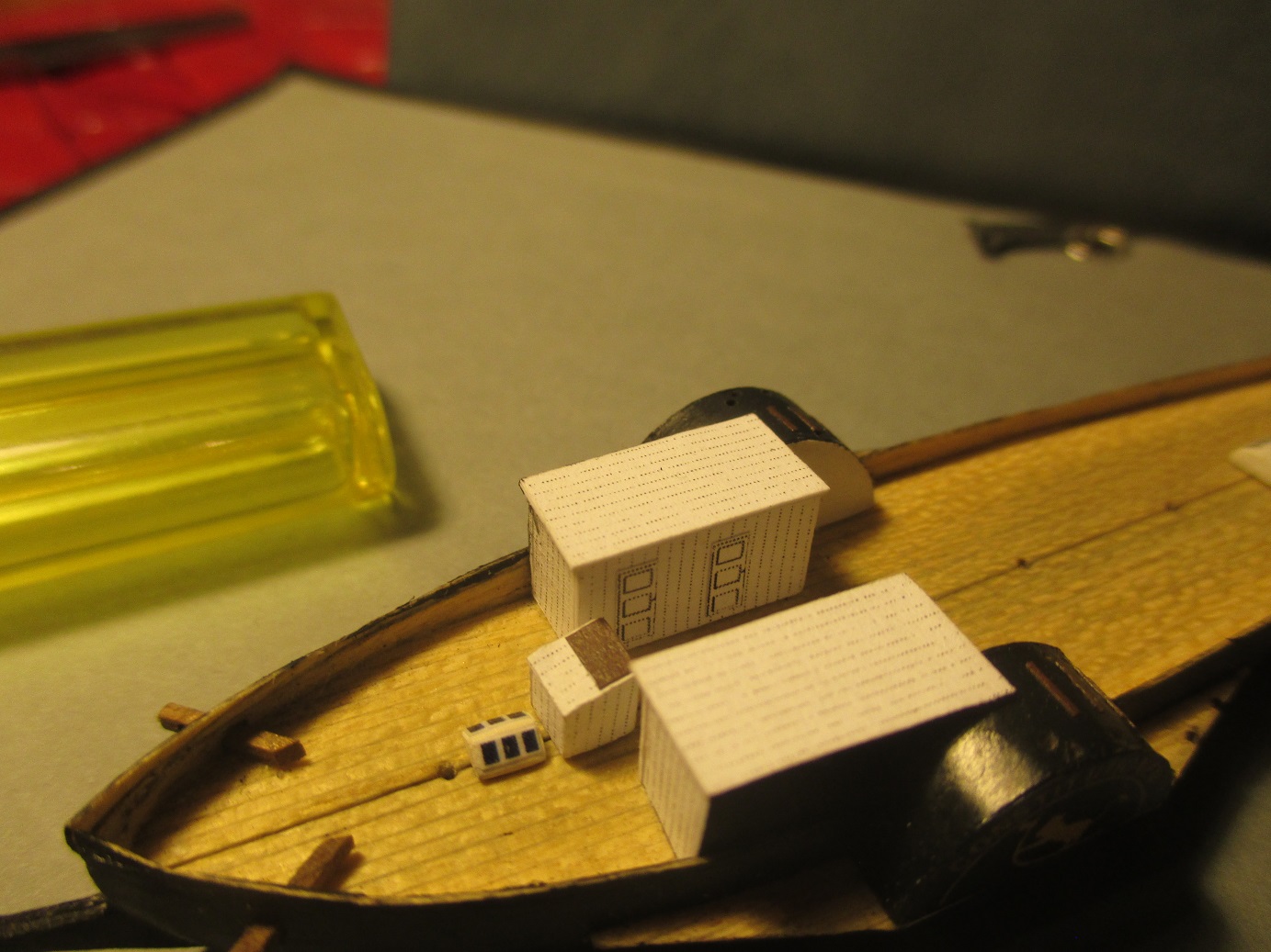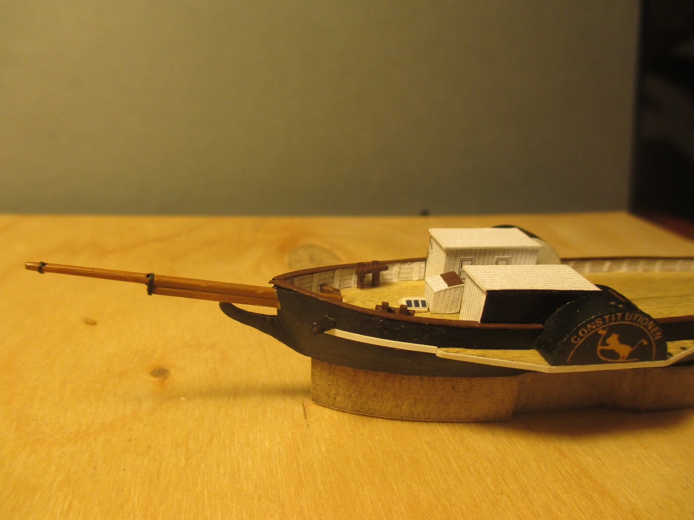 Po trzykrotnych nieudanych próbach wykonania pokładu w dwóch częściach postanowiłem zrobić deskowanie. Dlaczego? Niestety łączenie połówek kadłuba było zbyt widoczne. Oczywiście przy takiej skali nie uda mi się tego zrobić tak jak to było w rzeczywistości. Deseczki mają szerokość ok 1 mm. Zastanawiam się nad kolorem pokładu i czym go pomalować. Obecny kolor jest dla mnie za jasny i za czysty. Może macie jakieś pomysły?