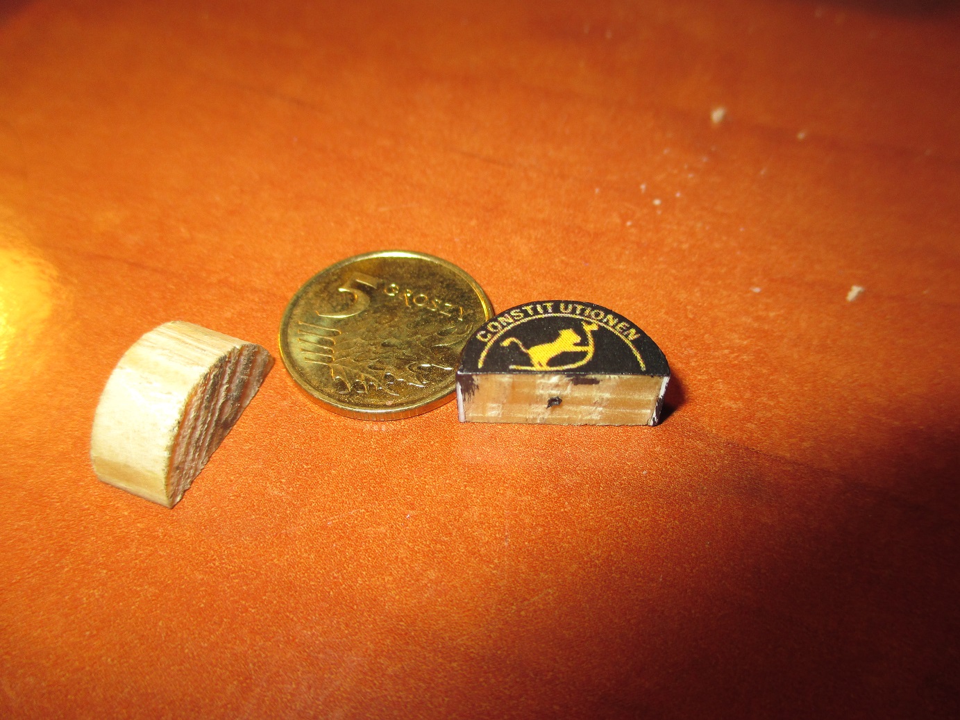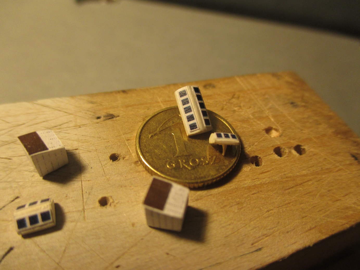 Moje tempo budowy daleko odbiega od Sławkowego. Ale zawsze coś do przodu. Grzebanie się z taką drobnicą zaczyna mnie już powolutku wku...ać. Tu zle przytne tam za mocno doszlifuje i trzeba od nowa zaczynać robotę.A końca nie widać. Wykonałem świetliki, zejściówki i oszukane koła napędowe. Jeszcze nie wiem czy świetliki i zejściówki zamontuję od razu na pokładzie czy będę je montował dopiero w butelce. Dlatego od razu zabezpieczyłem się kołeczkami centrującymi i otworami w pokładzie. Dzisiaj to na tyle.