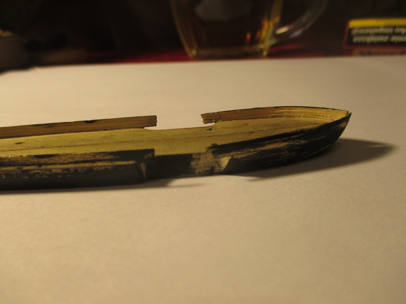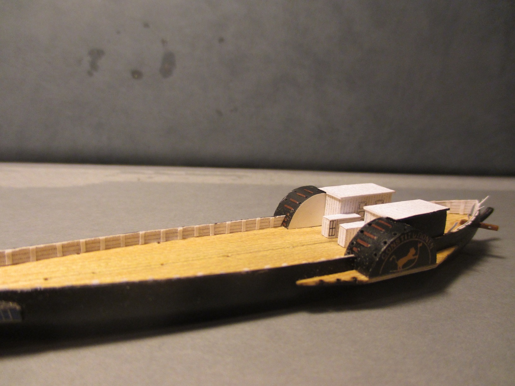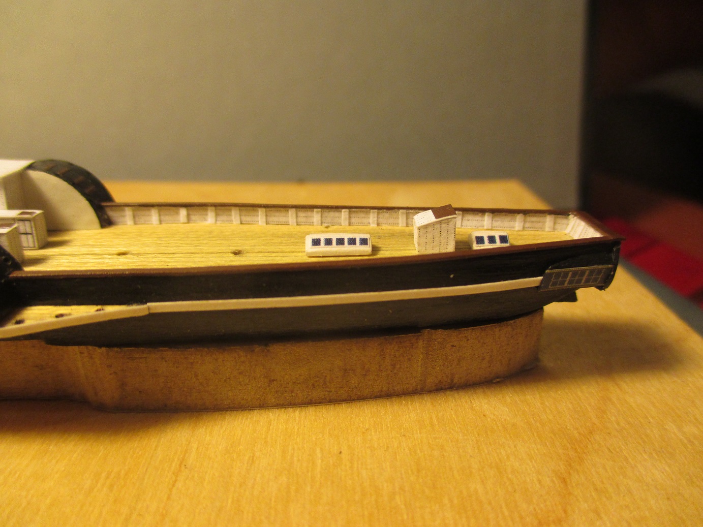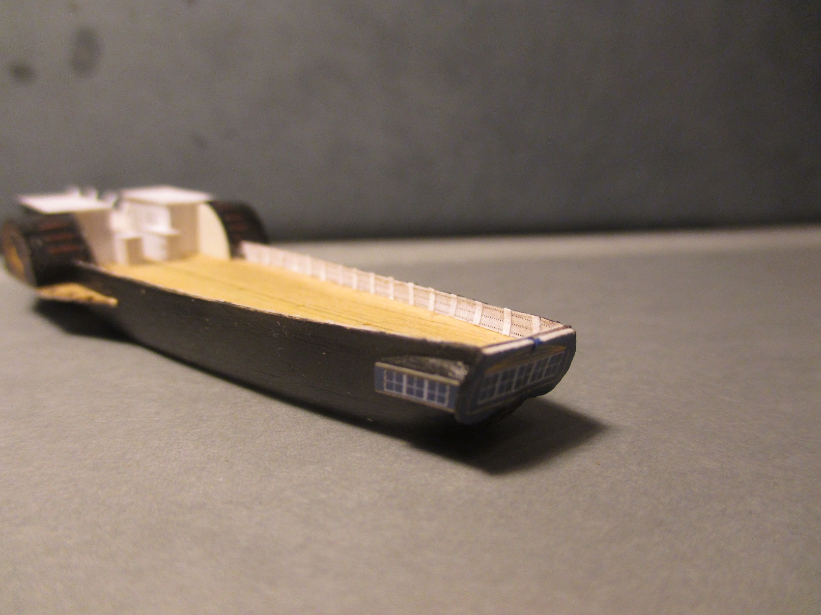 Po trzykrotnych nieudanych próbach wykonania pokładu w dwóch częściach postanowiłem zrobić deskowanie. Dlaczego? Niestety łączenie połówek kadłuba było zbyt widoczne. Oczywiście przy takiej skali nie uda mi się tego zrobić tak jak to było w rzeczywistości. Deseczki mają szerokość ok 1 mm. Zastanawiam się nad kolorem pokładu i czym go pomalować. Obecny kolor jest dla mnie za jasny i za czysty. Może macie jakieś pomysły?