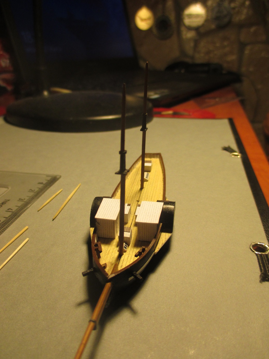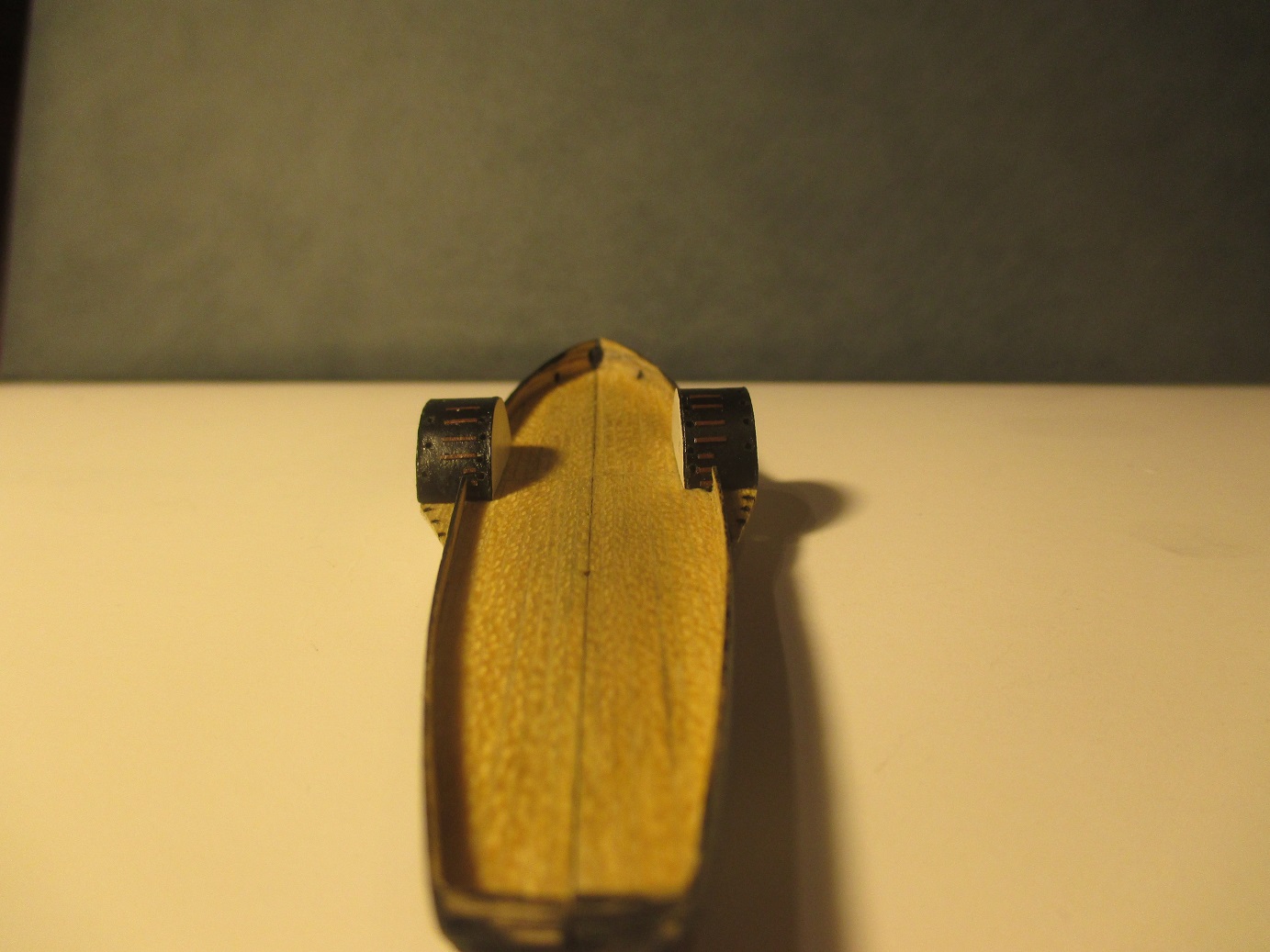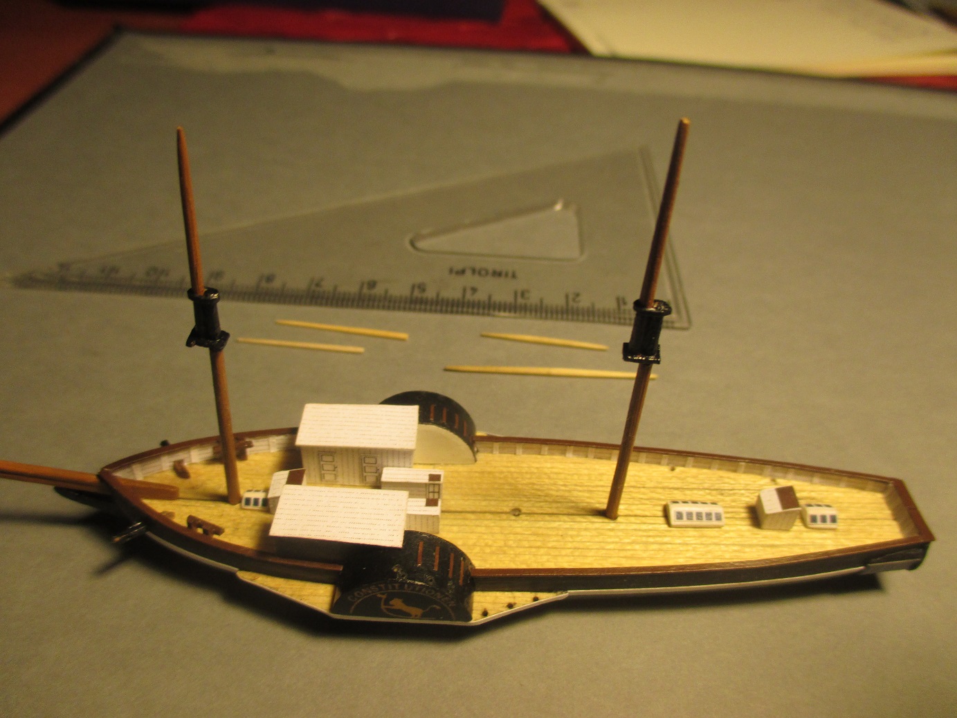 Po trzykrotnych nieudanych próbach wykonania pokładu w dwóch częściach postanowiłem zrobić deskowanie. Dlaczego? Niestety łączenie połówek kadłuba było zbyt widoczne. Oczywiście przy takiej skali nie uda mi się tego zrobić tak jak to było w rzeczywistości. Deseczki mają szerokość ok 1 mm. Zastanawiam się nad kolorem pokładu i czym go pomalować. Obecny kolor jest dla mnie za jasny i za czysty. Może macie jakieś pomysły?
