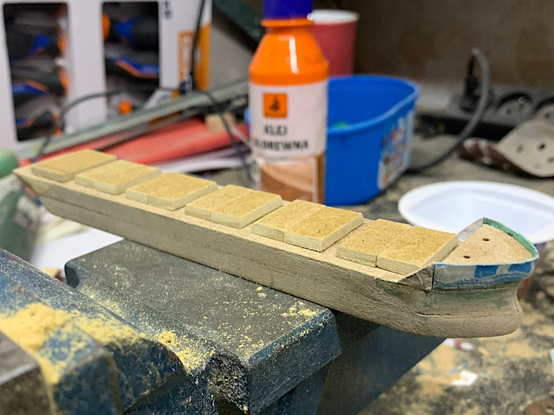 Kadłub nr2 wykonuje z płyty HDF 6mm grubości, wybór materiału był trochę przypadkowy- akurat walała się po warsztacie i jestem nią zachwycony, jest genialnie prosta w obróbce: łatwa w przycięciu, szlifowaniu itp. Drugi kadłub wykonany jest w 4 częściach, poniżej foto z przymiarki już wewnątrz butli. Nie robiłem jeszcze tak dużego modelu w butelce ( kadłub 190mm długości) i chciałem zobaczyć czy uda mi się w ogóle połączyć elementy w środku.