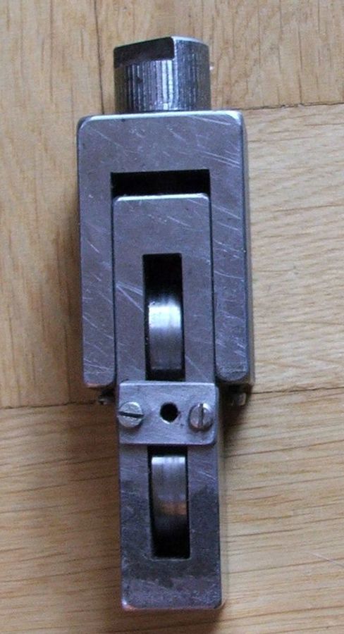 Jako,że zgromadzone części miały pierwotnie inne zastosowania trzeba było cała konstrukcję dostosować do nich.I tak dolne koło to nie łożysko a oprawa łożyska z gwintowaną tulejką.Tulejkę wkręciłem na nagwintowaną końcówkę przekładni.Z drugiej strony dopasowałem trzpień do oprawionego łożyska i oparłem go o taką metalową ławę(chyba z jakiegoś zamka typu Gerda)Trzpień jest nieruchomy a jedynie się opiera.Górne koło to łożysko.Całość obudowana bukowymi klockami.Trzpień z obu stron wsunięty w prostokątne otwory z luzem góra,dół ok.2mm.Z góry w klockach wprowadziłem śruby M6 służące jako docisk na trzpień łożyska.Śruby przechodzą przez dwie nakrętki.Jedna znajduje się wbita na fest w nawiercony otwór na spodzie pokrywy.(tych nie widać)Druga kontruje od góry.Regulacja nacisku za pomocą klucza.Całość skręcona dość mocno wkrętami i stanowi soliną konstrukcję.Pierwsze próby przeprowadziłem z drutem miedzianym 03,06,09.Zakres walcowania od 0,1-0,2mm.Drut najlepiej wcześniej wyżarzyć.Drut stalowy walcować też można,zwiększając stopniowo nacisk aż do zadowalającego rezultatu.