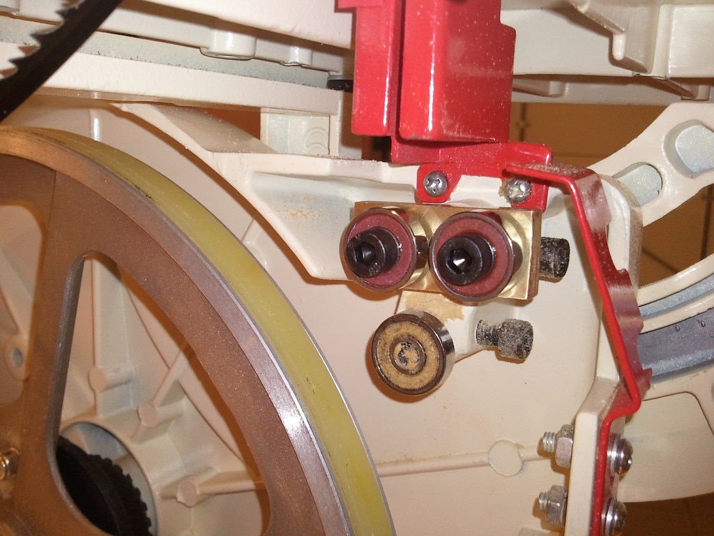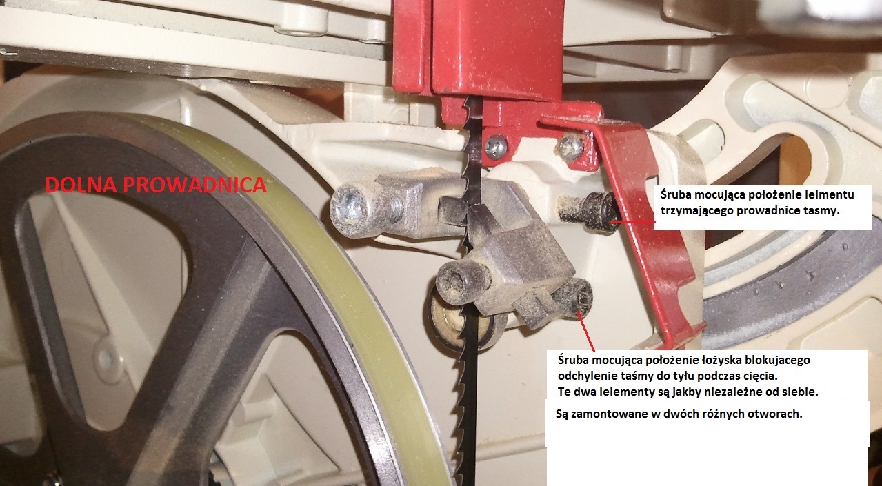 Tak, zapewne tak. Nasze piły mają jednak po jednym łożysku u góry i po jednym u dołu. Ograniczają (ustalają) one odchylenie taśmy podczas cięcia i naporu na nią. Mnie nie podobają się te prowadnice trzymające taśmę po bokach. T w miejsce elementu z prowadzącymi klockami wstawiłbym płytkę z dwoma łożyskami. Dobre będą te 625 2RS. Mają wymiary 5x16x5mm .Będzie to bardzo prosty element do wykonania.