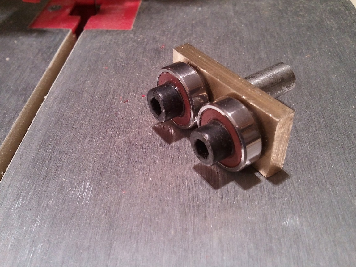 Zwróć uwagę że dobrze rozwiązana prowadnica posiada łożyska boczne z możliwością kasowania luzu i łożysko oporowe z tyłu które też pełni bardzo ważną funkcję.W Twoim rozwiązaniu luz pomiędzy prowadzoną piłą a łożyskami kasuje się obrotem prowadnicy bez możliwości bez regulacji indywidualnej.Może to wystarczy.Przydało by się jeszcze oporowe.Jak szaleć to szaleć.Super maszynka.R