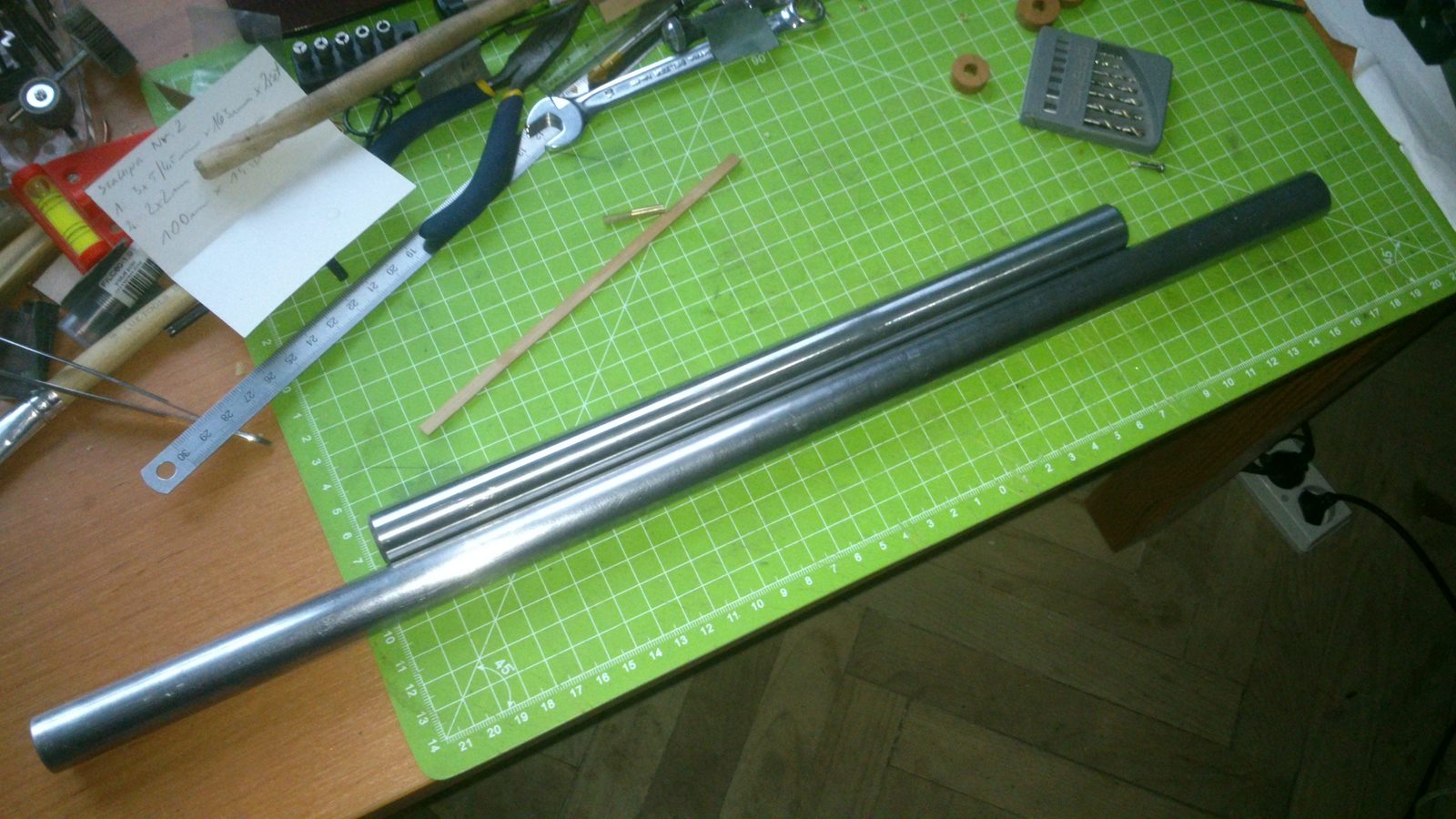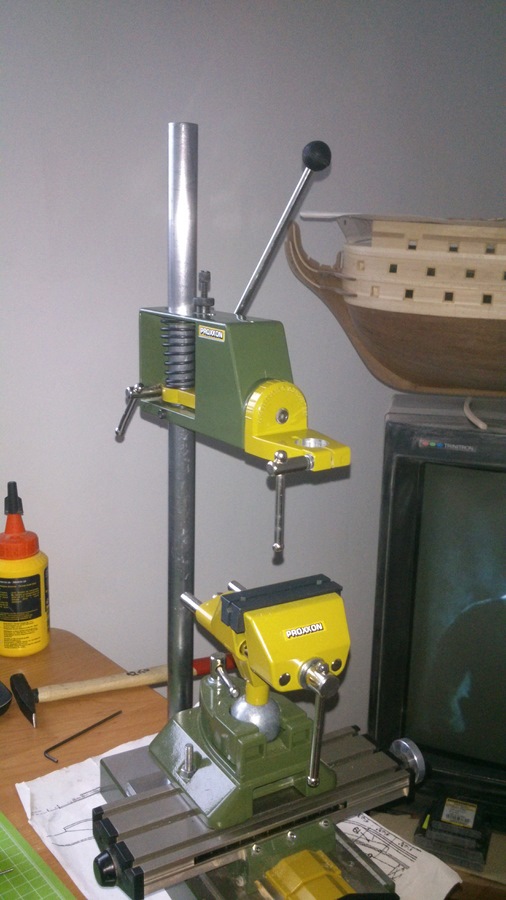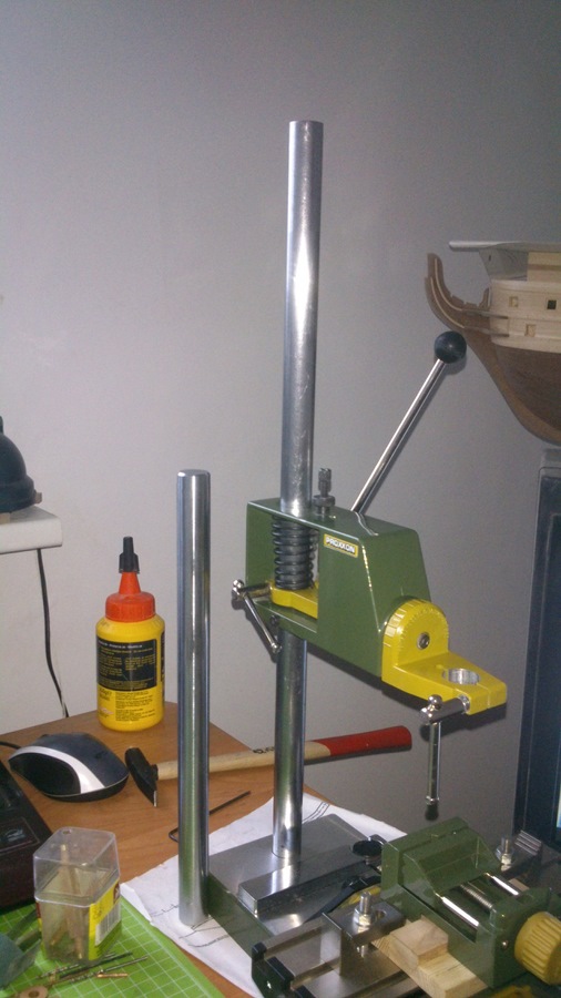 Nie dawno kupiłem sobie imadło Proxxona i pomyślałem sobie, że było by fajnie jak bym zamocował je na stole koordynacyjnym to będę mógł frezować elementy pod różnymi kątami, ale okazało się że pręt, wałek na którym jest umieszczony sam uchwyt szlifierki jest za krótki. Pogadałem z kolegą który zajmuje się obróbką metalu na tokarkach i zamówiłem u niego wałek o śr. 20 mm i dł. (chciałem długości 45 cm) ale miał akurat 50 cm i mam duży zapas na manewrowanie uchwytem. Sam wałek nie był toczony tylko ciągany, przeciągany nie znam się na tym ale z dokładności wymiaru i osiowości wałka jestem zadowolony. Całość po wymianie wygląda tak: