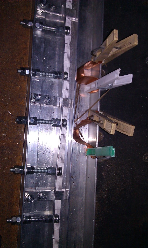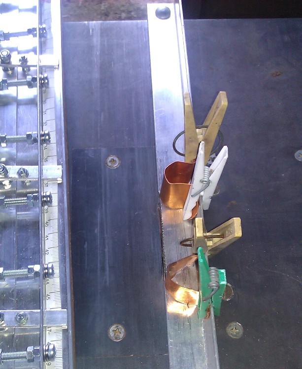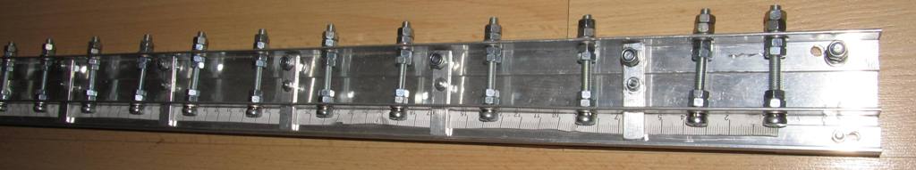 Jeden z kątowników 15x15x2 ponacinałem na jednym z ramion co 1 cm, to samo ramię wcześniej prze-frezowałem do grubości 1mm. W ten sposób powstała listwa giętka jednostronnie - jako element stanowiący oparcie zwężanej planki.