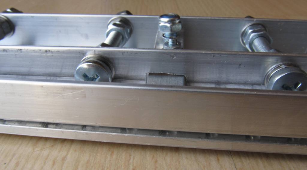 (śruby nie obracają się gdy optymalnie główka jest przykręcona do kątownika "wyginającego się", zastosowane podkładki sprężyste i płaskie łby śrub dają możliwość odchylenia się kątownika od osi śruby o kilka stopni.)