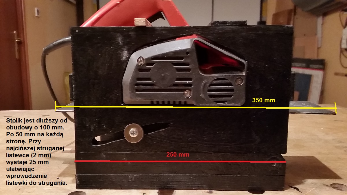 Moja jest z grubszej sklejki, bo 18 mm. Nie mieli cieńszych kawałków, a nie chciałem ciąć z całego arkusza. Myślę, że lepiej. Całość jest cięższa, stoi w miejscu i nie trzeba tego mocować ściskami. Jest cichsza jak bez tej obudowy. Stolik ruchomy wystaje po bokach. Jest dłuższy od strugarki i obudowy o 100 mm. Dlaczego - wyjaśnienie na rysunku. Pomalowałem na czarno, bo innej farby na zmarnowanie nie było w "magazynie stoczniowym".