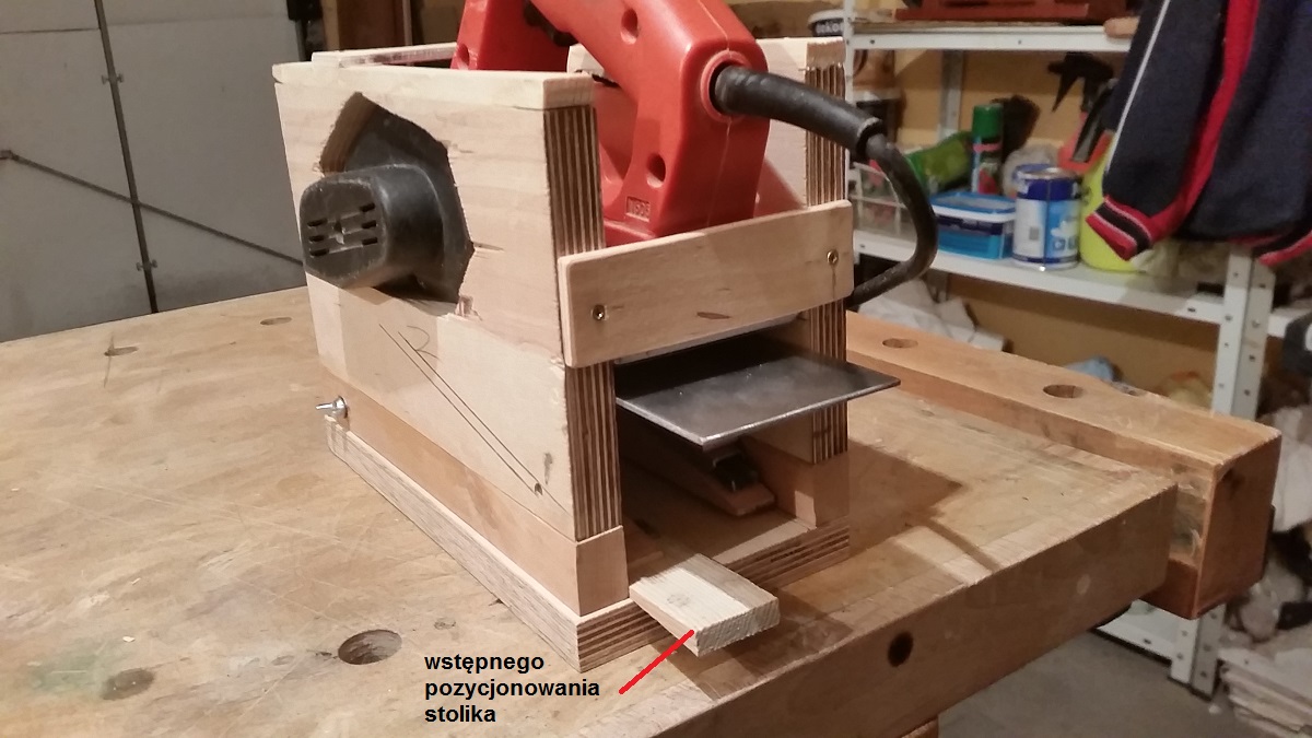 Nie zamieszczam rysunków, bo wymiary zależą od wymiarów struga. Moja potraktuje listewki o szer. 65 mm (szerokość ostrzy 70 mm) i grubości od 20 do 2 mm. Nie próbowałem jeszcze, ale myślę, że pogłaskałaby i cieńsze. Posuwu mechanicznego niet.