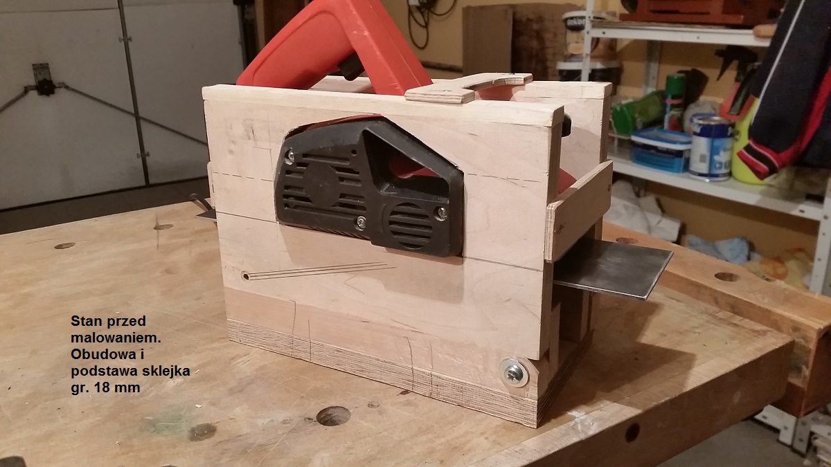Moja jest z grubszej sklejki, bo 18 mm. Nie mieli cieńszych kawałków, a nie chciałem ciąć z całego arkusza. Myślę, że lepiej. Całość jest cięższa, stoi w miejscu i nie trzeba tego mocować ściskami. Jest cichsza jak bez tej obudowy. Stolik ruchomy wystaje po bokach. Jest dłuższy od strugarki i obudowy o 100 mm. Dlaczego - wyjaśnienie na rysunku. Pomalowałem na czarno, bo innej farby na zmarnowanie nie było w "magazynie stoczniowym".