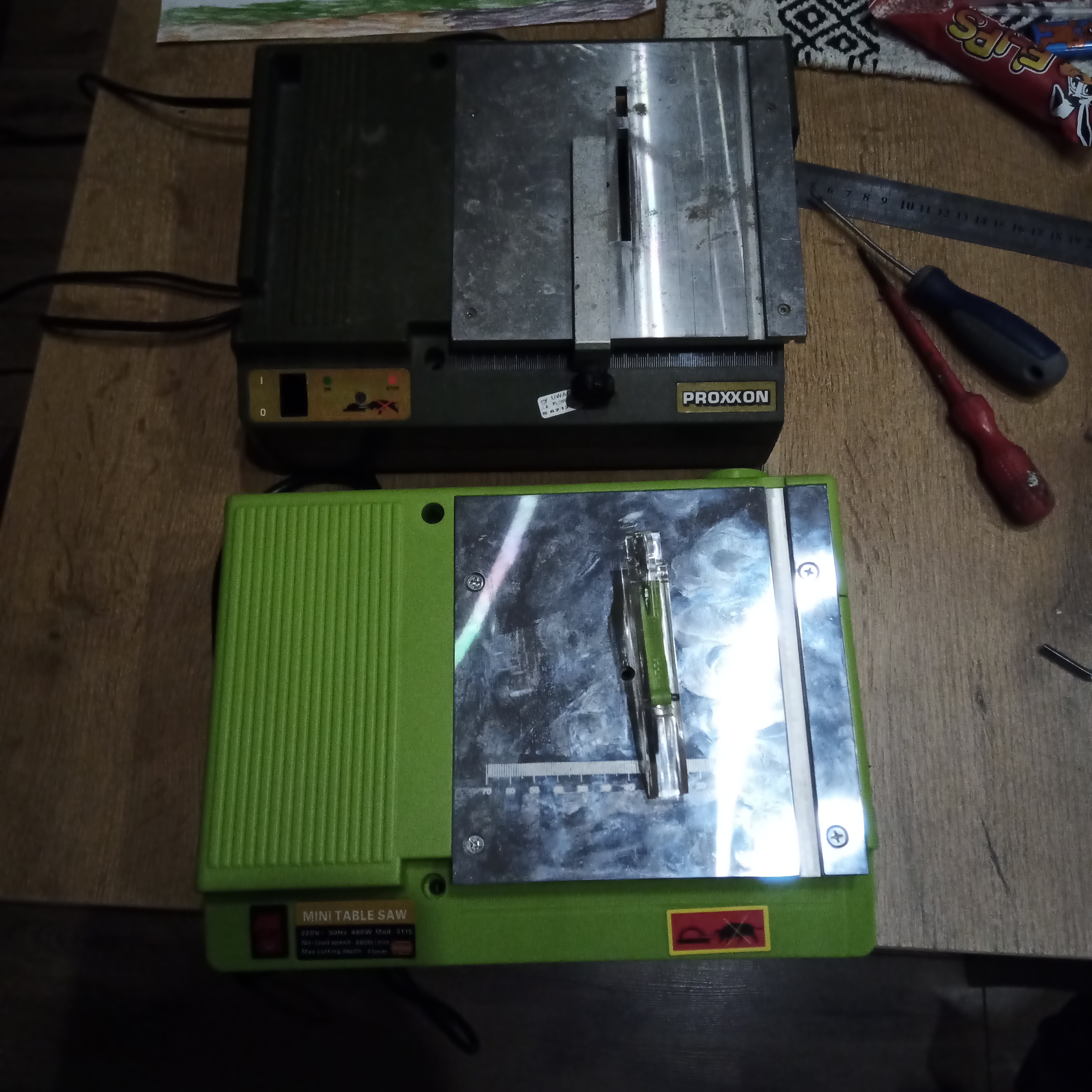 No i o ile silnik chińczyka sobie z taką tarczą poradzi, to jakbym zaprzągł tam silniczek z proxxona to kiepsko go widzę na takim cięciu. Więc mam dwie piłki stołowe - jedną do grubszych listewek a drugą do nie wiem czego ;p (o ile ją naprawię)