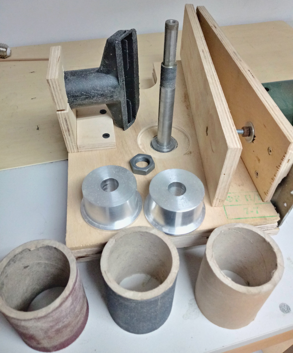 Części składowe przystawki. Oś od dołu podparta jest dość solidnym łożyskiem kulkowym. Nakrętka i oś z gwintem o drobnym skoku, który zapobiega samoczynnemu rozkręcaniu. Stożkowe nakładki z aluminium, Natomiast sam bęben, to nic innego, jak kawałki kartonowych rur. To bardzo tani sposób, więc można przygotować sporą ilość bębnów zapasowych, z papierem o różnej gradacji. Papier jest naklejony, po zużyciu bęben można wyrzucić i założyć nowy.