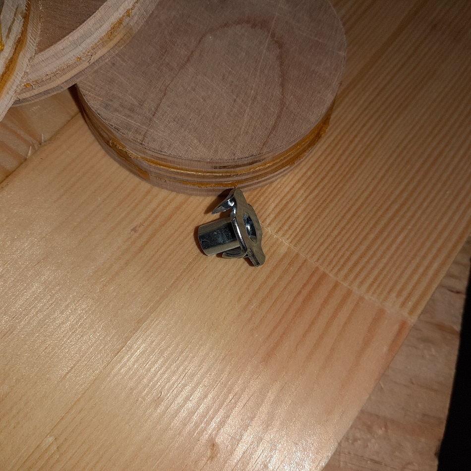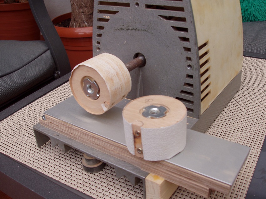 Jedź do Brico na Skarszewskiej, tam w stolarni mają skrzynkę z odpadami sklejki, dla modelarzy zupełnie wystarczające kawałki. Krążki wytnij otwornicą, brzegowe okuj nakrętkami pazurkowymi, sklej dociskając na pręcie gwintowanym i szlifuj dopiero po podłączeniu do napędu. To urządzenie nie może mieć luzów. Najprostrze masz na załączonym zdjęciu, a to co zrobiłeś wyrzuć. Janek