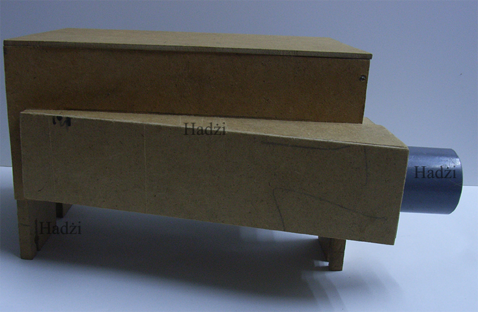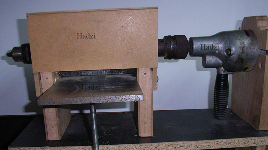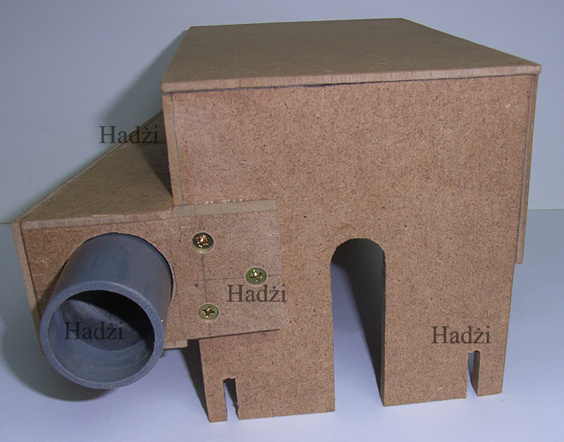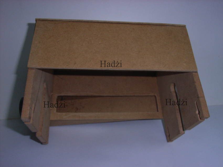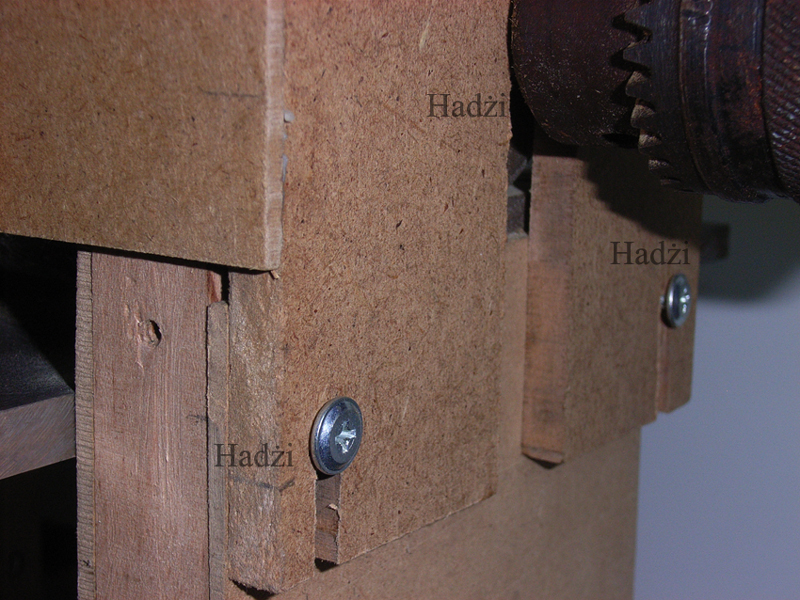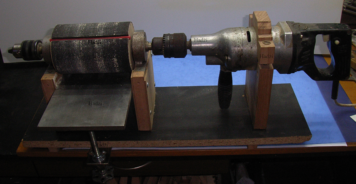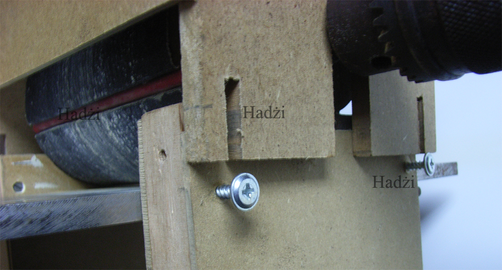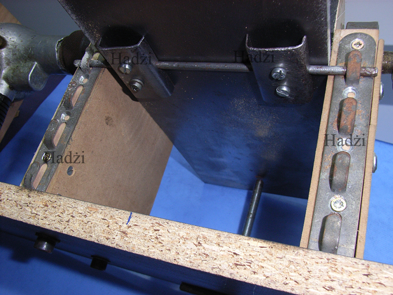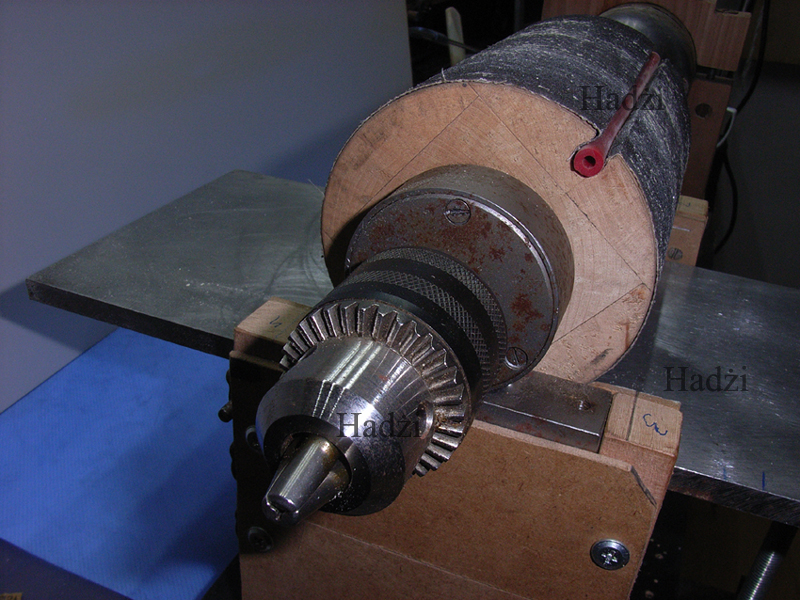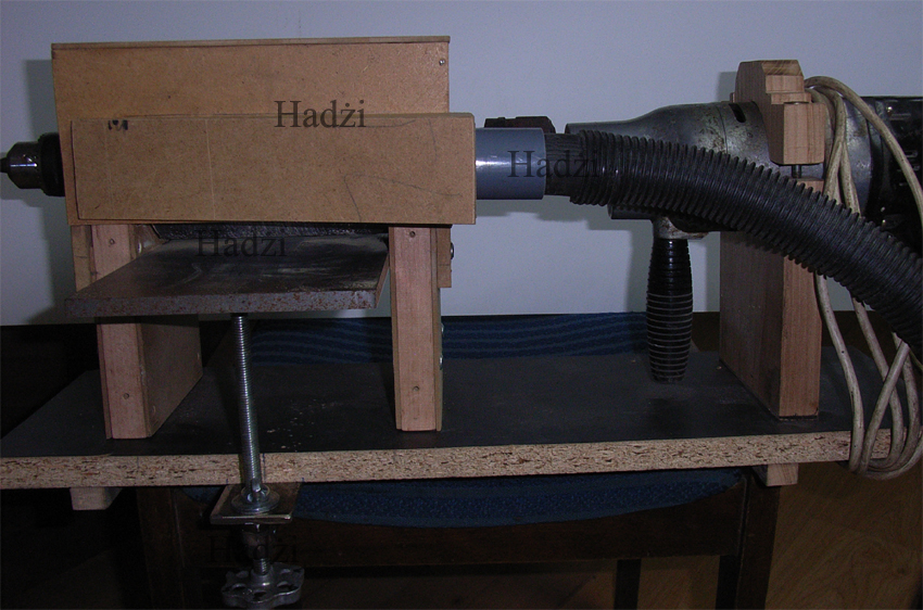 Nareszcie skończyłem budowę szlifierki wałkowej, która jest pierwszym elementem kombajnu (drugim będzie tokarka). Wiele tu na kodze prezentowano już takich szlifierek. Każda jest inna i niepowtarzalna. W mojej nie ma nic szczególnego, no może oprócz stołu. Napęd stanowi stara polska wiertarka. Wał jest ułożyskowany, prawy koniec przystosowany do uchwytu wiertarki. Lewy koniec zakończony jest stożkiem, na którym osadzony jest drugi uchwyt wiertarski (do napędu tokarki). Na wale osadzony jest wałek drewniany o średnicy 10 cm i długości 15cm. W tymże wałku wyfrezowane są dwa rowki. Do mocowania papieru ściernego służą dwa wężyki gumowe. Wałek ścierny przykryty jest pokrywą wykonaną z MDF-u z króćcem ssącym po prawej stronie przedniej ścianki osłony wałka w strefie wypychania pyłu. Pokrywa jest nasadzana z góry i dokręcana śrubkami po dwie z każdej strony. Aby ja zdjąć trzeba poluzować te śrubki i unieść do góry. Stół jest wykonany z płyty stalowej. Od spodu przykręcony jest pręt stalowy służący, jako oś. Z tyłu ścianek bocznych przykręcone są dwie listwy z czterema wspornikami osi stołu na każdej. Ta szlifierka będzie służyła nie tylko do celów modelarskich, więc z tego powodu są te wsporniki do ustawiania stołu w zależności od grubości obrabianego materiału. W najwyższym położeniu osi stołu i opuszczonej płycie max do dołu można szlifować materiał grubości 25 mm. Podnoszenie płyty stanowi śruba M 10 z pokrętłem w prowadnicy zespawanych trzech nakrętek od spodu uchwytu. Od góry na śrubę nałożona jest szeroka podkładka i nakręcona nakrętka motylkowa do kontrowania położenia śruby. Ze względu na możliwość zmiany wysokości osi nie ma i nie będzie listwy z podziałką milimetrową ( musiałoby ich być cztery, po jednej do każdego położenia osi. Jeden pełny obrót śruby powoduje zeszlifowanie 0,5 mm obrabianego materiału. Do testowania na wałek założyłem papier ścierny na płótnie (polski). Docelowo założony będzie papier żółty lub biały firmy szwedzkiej. Ten papier nie zakleja się i tak szybko nie wyciera. Po strzepnięciu pyłu wygląda prawie jak nowy. Jest droższy niż nasz, ale coś za coś. Samo wykonanie i użyte materiały nie są eleganckie, bo maszyna ma spełniać dokładnie swoje zadanie, a nie ma ładnie wyglądać. Poniższe zdjęcia przedstawiają jej szczegóły.