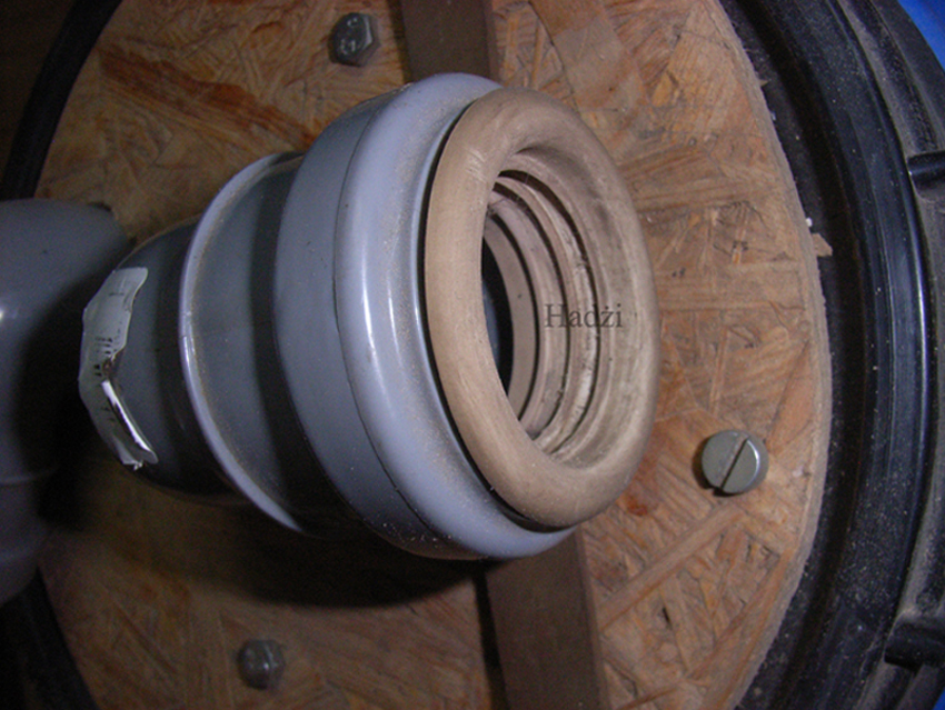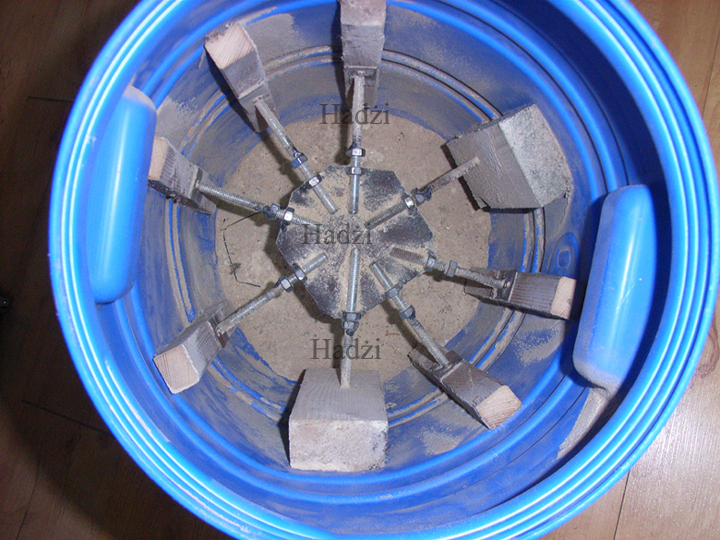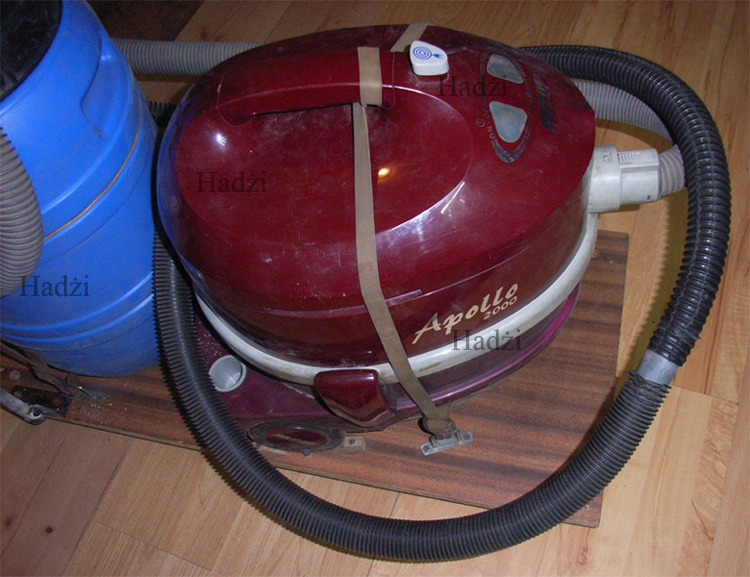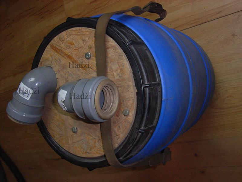 Przedstawiam moje urządzenie do odpylania. Sam pomysł podpatrzony w necie i zmodyfikowany do moich potrzeb. Urządzenie składa się z trzech podstawowych elementów tz.: Podstawy mobilnej, urządzenia ssącego i separatora cyklonowego. Podstawą jest płyta meblowa wyposażona w cztery kółka jezdno-skrętne (dostępne w marketach budowlanych). Uchwytu umożliwiającego przemieszczanie urządzenia (pałąk od starej kosiarki) oraz kilku oczek do przytwierdzania odkurzacza i separatora do podstawy przy pomocy pasów gumowych. Urządzeniem ssącym jest stary odkurzacz APOLLO o mocy 2000W. Jest to odkurzacz workowy (worki podłużne). Separatorem jest beczka plastikowa z deklem zakręcanym o pojemności 30 litrów (kupiona w sklepie ogrodniczym). Dekiel od góry został wzmocniony krążkiem wyciętym z płyty OSB. Wyciąłem w nim dwa otwory o fi 50mm. Jeden centralnie w środku, drugi przy brzegu dekla. Od spodu dekla w miejscu centralnego otworu przykręcony jest króciec z rury blaszanej fi 100mm i długości 200mm. W otwór centralnym z góry wciśnięte jest kolanko PCV o kącie 90* i fi 50mm. Do niego wciśnięty jest wąż od odkurzacza poprzez gumową uszczelkę redukcyjną. Do bocznego otworu również jest wciśnięte takie samo kolanko, ale od spodu nałożone na nie drugie kolanko, którego wylot skierowany jest na ściankę beczki. Do tych kolanek wciśnięty jest wąż ssący podłączany do urządzeń w celu odpylania. Poprzez ten wąż zasysane przez odkurzacz trociny i inne odpady wpadają do separatora na ściankę beczki ruchem wirowym, wytracają prędkość i opadają na spód beczki. Opadają na dno te frakcje grubsze i cięższe. Pył ze szlifierek jest zasysany do worka w odkurzaczu. Kiedy nowy worek się wypełni, a jest on podłużny rozcinam go na końcu, wytrzepuję i później ten koniec ściskam skręcając go dwoma płaskownikami z podkładkami gumowymi. Wykorzystuje powtórnie do póty, do puki się nie poprzeciera. Ssanie z odkurzacza jest tak silne, że potrafi boki beczki wessać do środka, dlatego musiałem wykonać coś, co by rozpierało ją od środka. Wyspawałem, więc takiego „pająka”. Poniższe zdjęcia przedstawiają szczegóły.