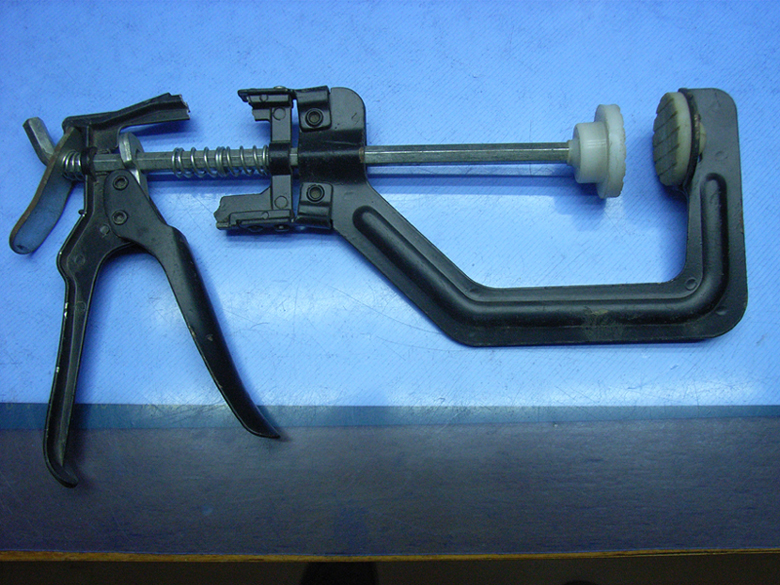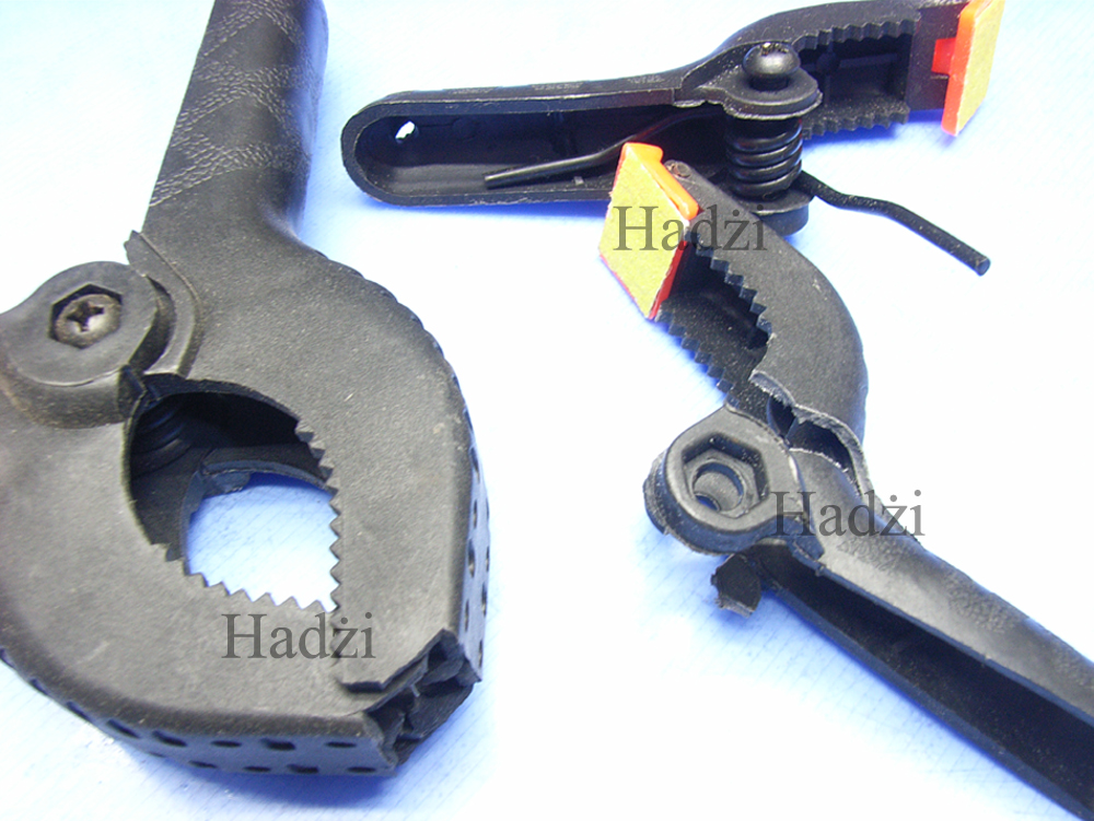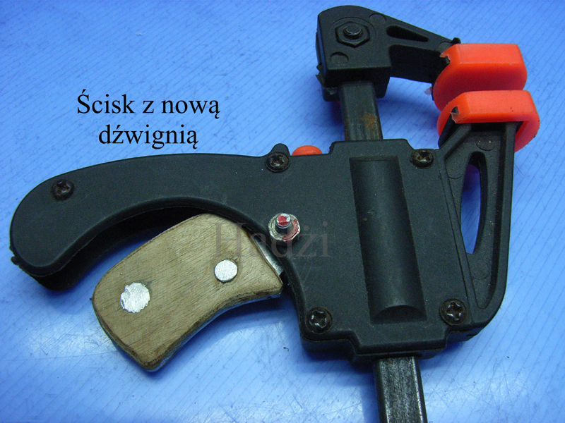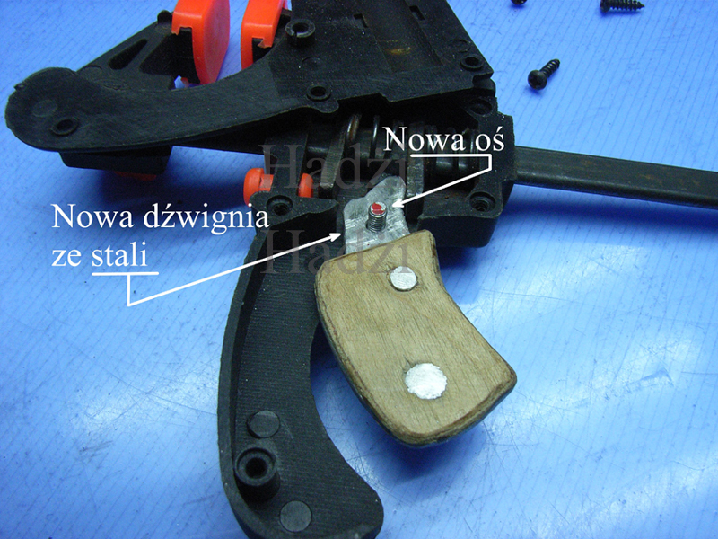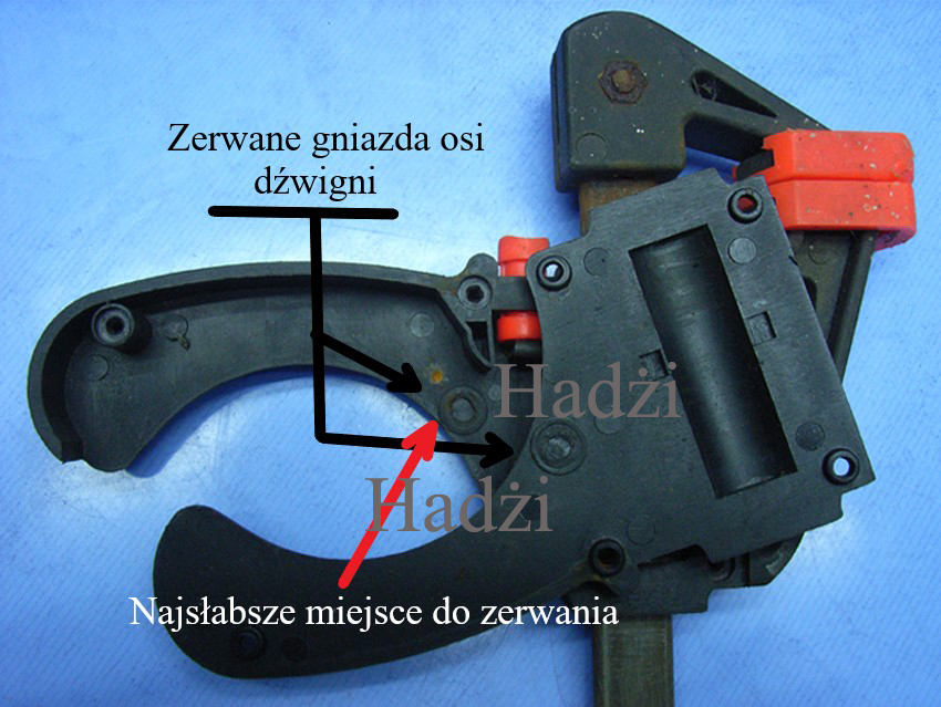 Kupiłem też inny szajs w sieciówce, czyli ścisk dźwigniowy inny niż pozostałe. Cały metalowy, a jakże. Plastykowe są tylko nakładki ściskające. I co? Ano trzask prask i ścisk zepsuty. Nie trzeba wcale używać dużej siły, aby go złamać. Widocznie zamiast ściskać dwa kawałki drewna trzeba ich używać do ściskania tektury falistej. I wcale nie sprzedawali ich na kilogramy. Zdjęcia przedstawiają uszkodzenie, a ja zastanawiam, co z tym fantem zrobić. Pewnie z czasem coś wykombinuję.