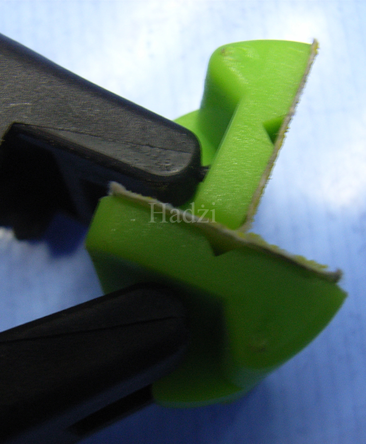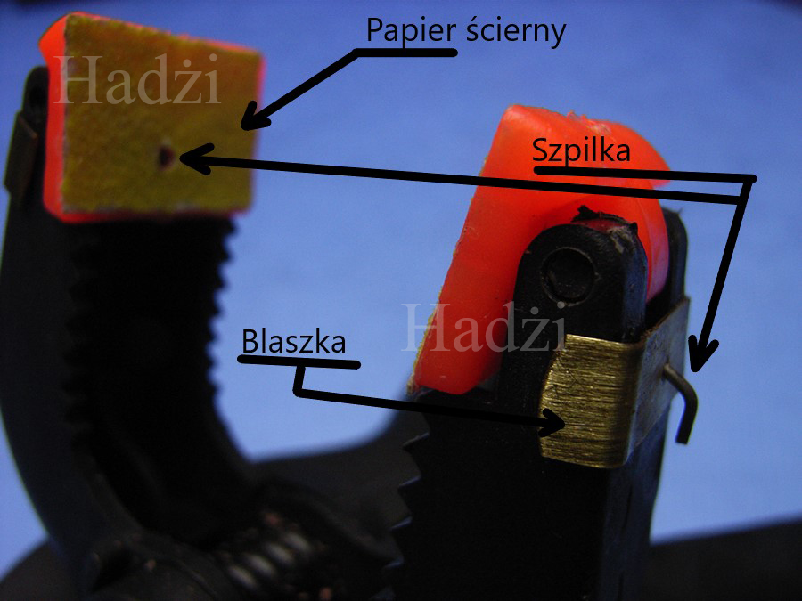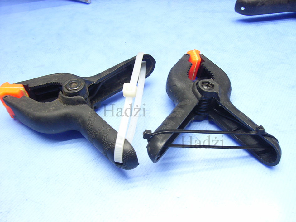 Czy komuś z Was przydarzyło się coś takiego? Bo mnie nie raz. Wkurzył mnie ten szajs kupiony w sieciówce niemieckiej. Zazwyczaj rozłamywało się jedno ramię, więc jak się drugi ścisk rozłamał, to dwa ramiona dobre łączyłem z sobą. Ale jak zniszczyłem już którąś z kolei, to mnie zaczynał szlag trafiać. Sprężyny są dość mocne, natomiast tworzywo słabe. Kiedy się jeden ścisk z hukiem ześliznął, to na szczęki nakleiłem papier ścierny. Ścisk już trudniej się ześlizgiwał lub wcale, ale nieostrożnie zdejmując znów strzelił i się rozłamał. Rozłamywał się wówczas, gdy szczęki uderzały się z całą siłą sprężyny. Myślałem, co by tu zrobić, aby temu zapobiec. O czymś, co by zamortyzowało uderzenie. Wpadłem na pomysł, aby spiąć końce rękojeści czymś, co by nie dopuszczało do uderzenia. I do głowy mi przyszła zwykła trytka. Przewlokłem przez istniejące otwory i tak zacisnąłem, aby szczęki się całkiem nie stykały. Jeżeli trzeba coś cienkiego ścisnąć, to zawsze można coś na grubość podłożyć. Trytka zaczęły później wkurzać mnie te ruchome szczęki, które w najbardziej nie odpowiednim momencie się wywracały. Czy ktoś używa ścisków z takimi szczękami? Bo ja nie. Zacząłem się zastanawiać, w jaki sposób ograniczyć to wywracanie Wymyśliłem też najprostszy sposób. Przewierciłem wiertłem 1 mm szczęki na wylot. Od spodu włożyłem szpilki krawieckie. U góry nałożyłem na szpilkę blaszkę z otworem. Blaszkę przykleiłem do stałej szczęki i zagoiłem po bokach, Szpilkę zagoiłem do góry i obciąłem nadmiar. Zachowane jest minimalne wychylenie szczęk, jakie jest przy zamkniętych szczękach w pozycji „0”. I problem zniknął. Na przedstawionych zdjęciach widać szczegóły.