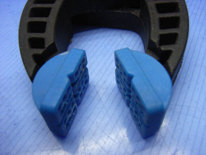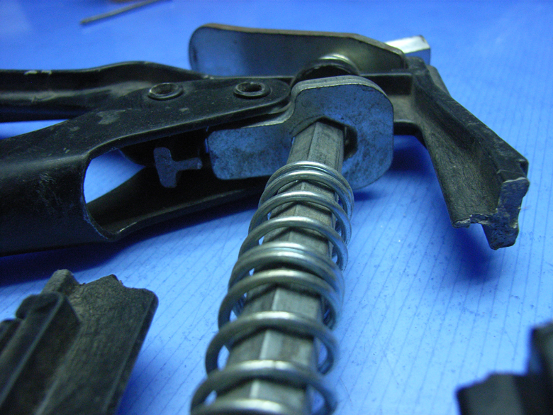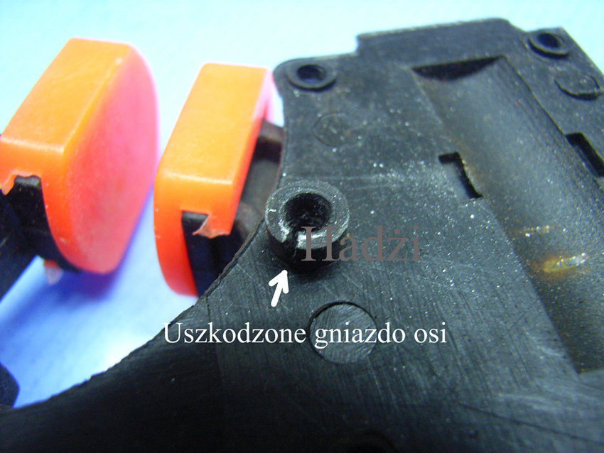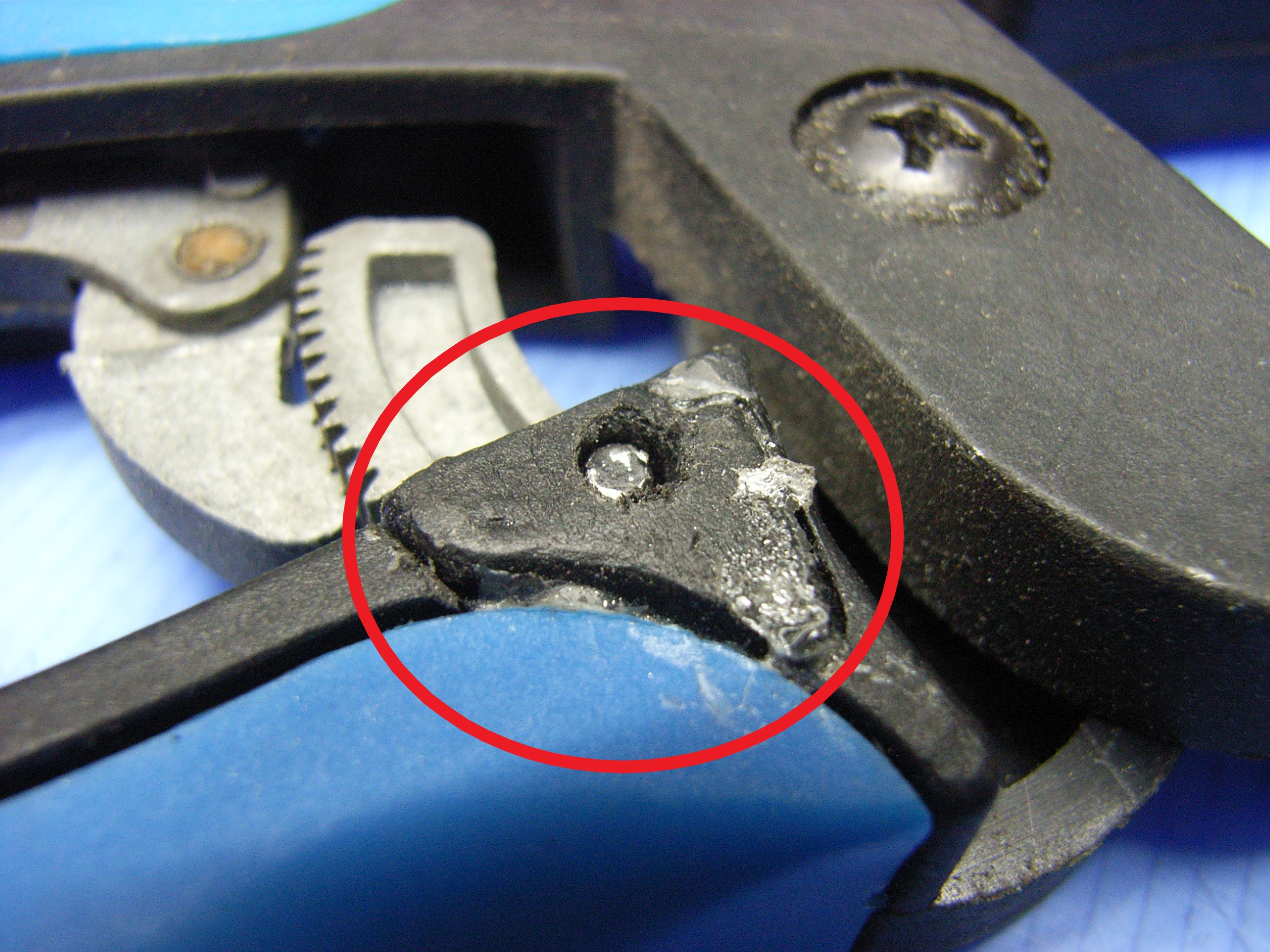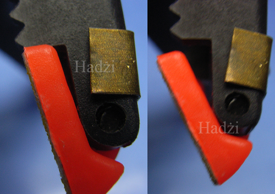 Mam też takie ściski zatrzaskowe. Jeśli chodzi o budowę są dość solidne. Szczęki się odchylają, ale nie wywracają na drugą stronę. Nie mniej też mają jedną wadę. Zębatka zatrzaskowa jest z jakiegoś metalowego odlewu. Jedna jest nieruchoma, druga odchylana. I właśnie ta nieruchoma jest osadzona w plastiku i zaklejona takim trójkątem (zaznaczyłem czerwonym kółkiem na zdjęciu. Tam właśnie się też wyłamuje. Skleiłem to we właściwym miejscu, przewierciłem i wcisnąłem metalowy sworzeń. Mam ich cztery, dwa duże i dwa małe. Jeden z tych małych już reanimowałem.