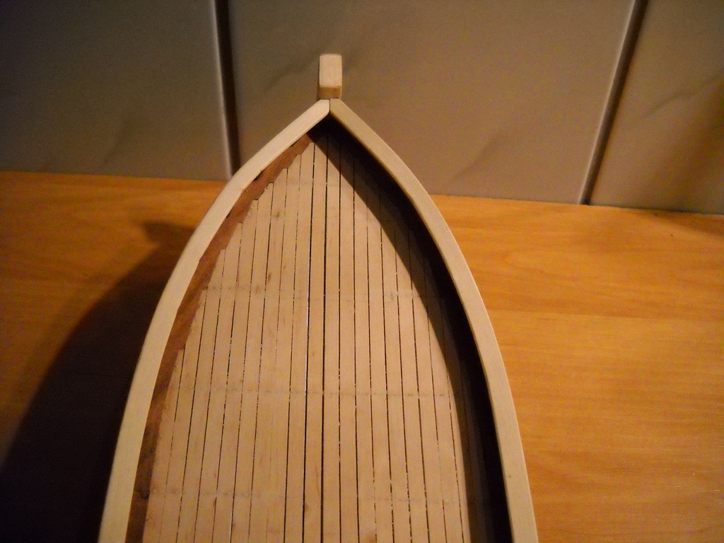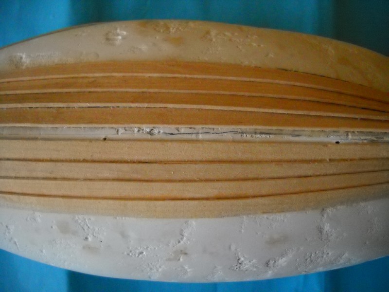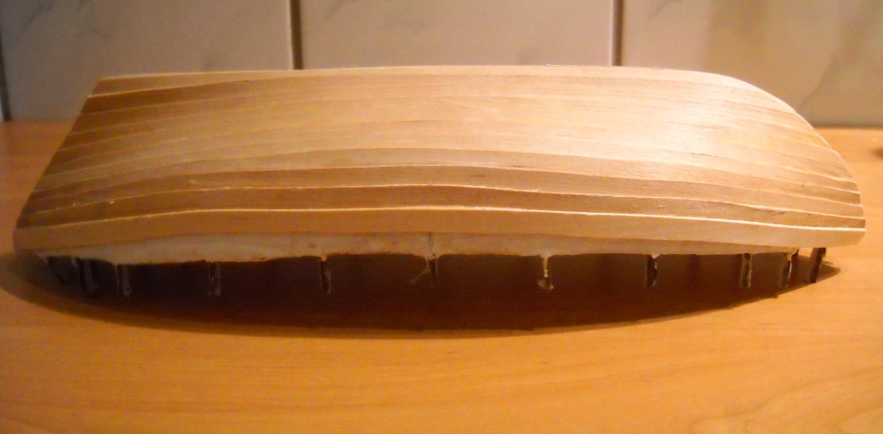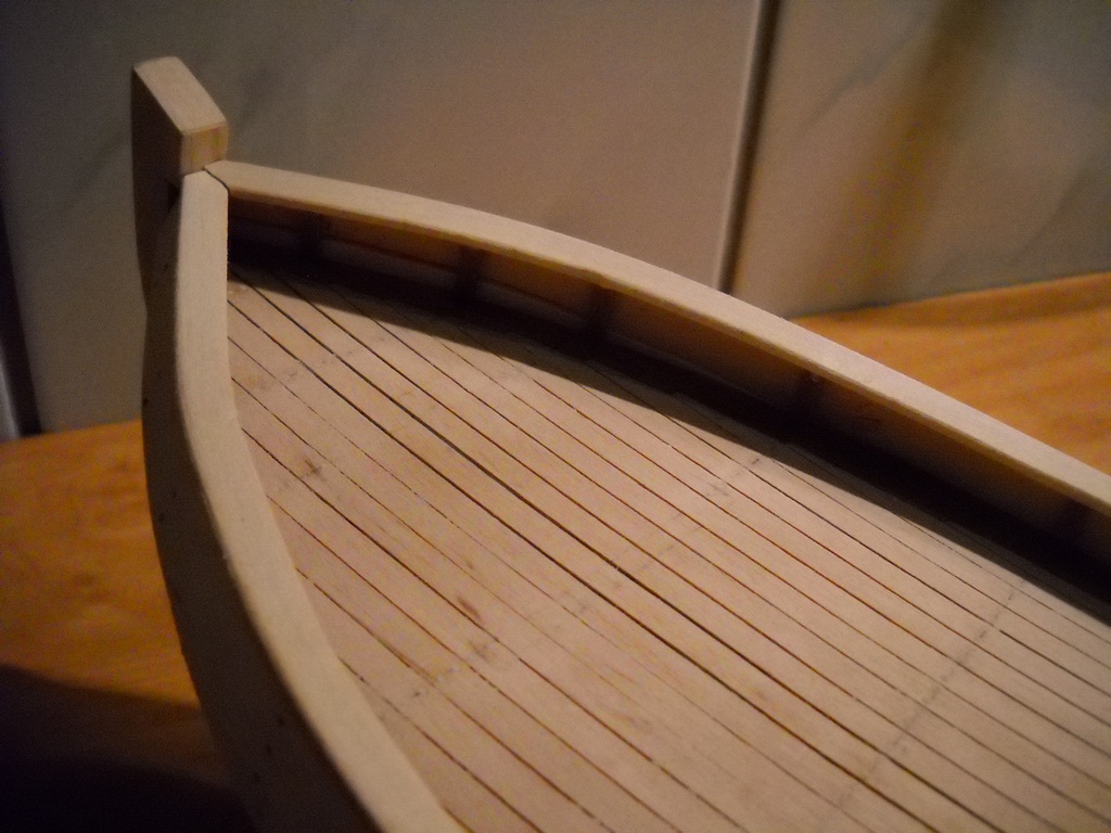 Pod powyższym masz rozważania na temat ilości planek w miejscu rufy, dziobu oraz śródokręcia. Liczby te nie uwzględniają nadburcia, które powinno mieć wysokość 0.5m - przelicz sobie w skali ile to będzie i ile listewek.