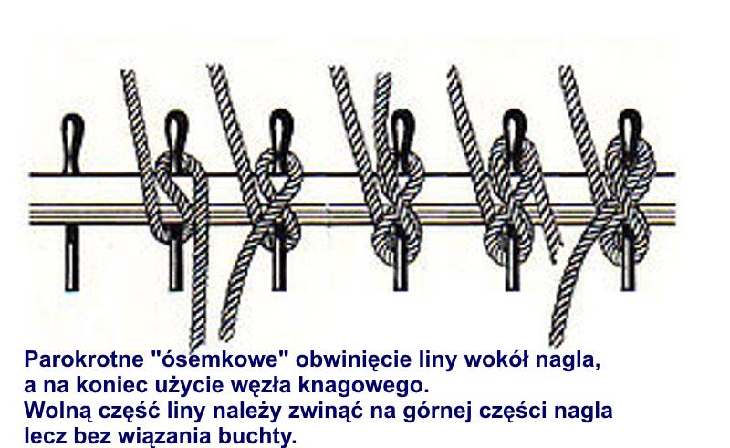 Cyt.(Wikipedia)"Nagiel, Kołek (ang. belaying pin) - drewniany lub metalowy, odpowiednio ukształtowany kołek pionowo, do połowy jego długości włożony w otwór nagielbanku (kołkownicy). Służy do obkładania (mocowania) lin. Spełnia podobną rolę jak knaga, z tym że znacznie łatwiej na nim pracować, gdy jak to bywa na żaglowcach jedną linę wybiera wiele osób. Kiedyś liny produkowane były z włókien naturalnych (np. sizal, konopie, juta, bawełna) znacznie zatem zmieniały długość zależnie od zmian wilgotności. Przez to pracująca pod dużym obciążeniem zaknagowana lina mogła zacisnąć się tak, że jedynym sposobem, aby ją zwolnić było przecięcie liny. Aby tego uniknąć na naglach nie stosowano węzła knagowego, a jedynie wielokrotnie linę obwijano "w ósemkę" naprzemiennie wokół górnej i dolnej części nagla. Wolną cześć liny swobodnie (bez związywania) buchtowano na górnej części nagla. Obecnie, gdy liny żeglarskie produkowane są nieomal wyłącznie z włókien syntetycznych praktycznie nie ma ryzyka zaciśnięcia się jej na naglu. Na wielu żaglowcach dopuszcza się, a nawet zaleca parokrotne "ósemkowe" obwinięcie liny wokół nagla, a na koniec (zwłaszcza dla cieńszych lin) użycie węzła knagowego."