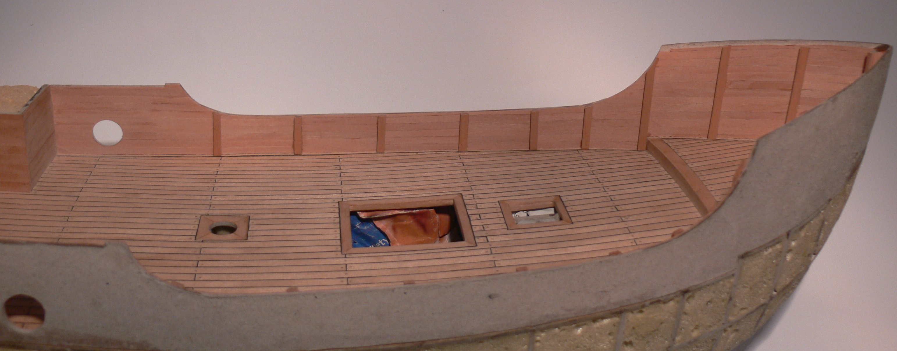 W trakcie szlifowania szpachli przez źle chwycony model burta pokładu rufowego pękła w miejscu łączenia jej z pokładem zniszczenia były małe i udało się je łatwo naprawić. To mało przyjemne zdarzenie zaowocowało wykonaniem wzmocnienia/zabezpieczenia burt przed kolejnymi podobnymi wypadkami. W żadnej relacji kolegów nie natknąłem się na nic podobnego dla tego ośmielam się o tym wspomnieć :) pomysł jest na tyle prosty że nie wymaga szczegółowego opisywania a wszystko jest widoczne na zdjęciach.