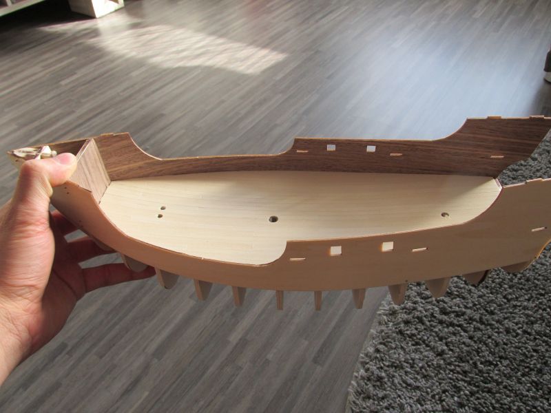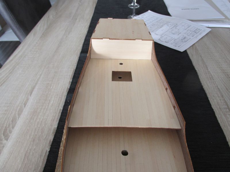 Teraz oklejam pokład fornirem. W instrukcji było żeby kleić całe pasy forniru ale ja wolałem pociąć na kawałki żeby imitowało deski. Na forum też widziałem że niektórzy malują markerem boki forniru ale mi się to mniej podoba. Do klejenia forniru używałem kleju uhu hart, ponieważ uhu coll nie kleił mi za dobrze. Jest ok i to jest najważniejsze.