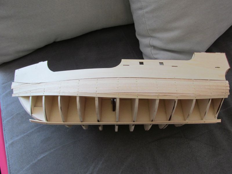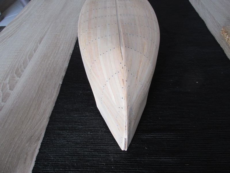 teraz czas na oklejanie kadłuba listewkami. Sprawiło mi to trochę problemu i zajęło całkiem sporo czasu. Na szczęście kadłub nie ma za dużych krzywizn i nie musiałem namaczać listewek by je wygiąć. Listewki najpierw przybijałem a potem jeszcze kleiłem od spodu. Przy kończeniu jak już nie mogłem dać kleju od spodu to kleiłem też listewki na boku przyklejając je do siebie.