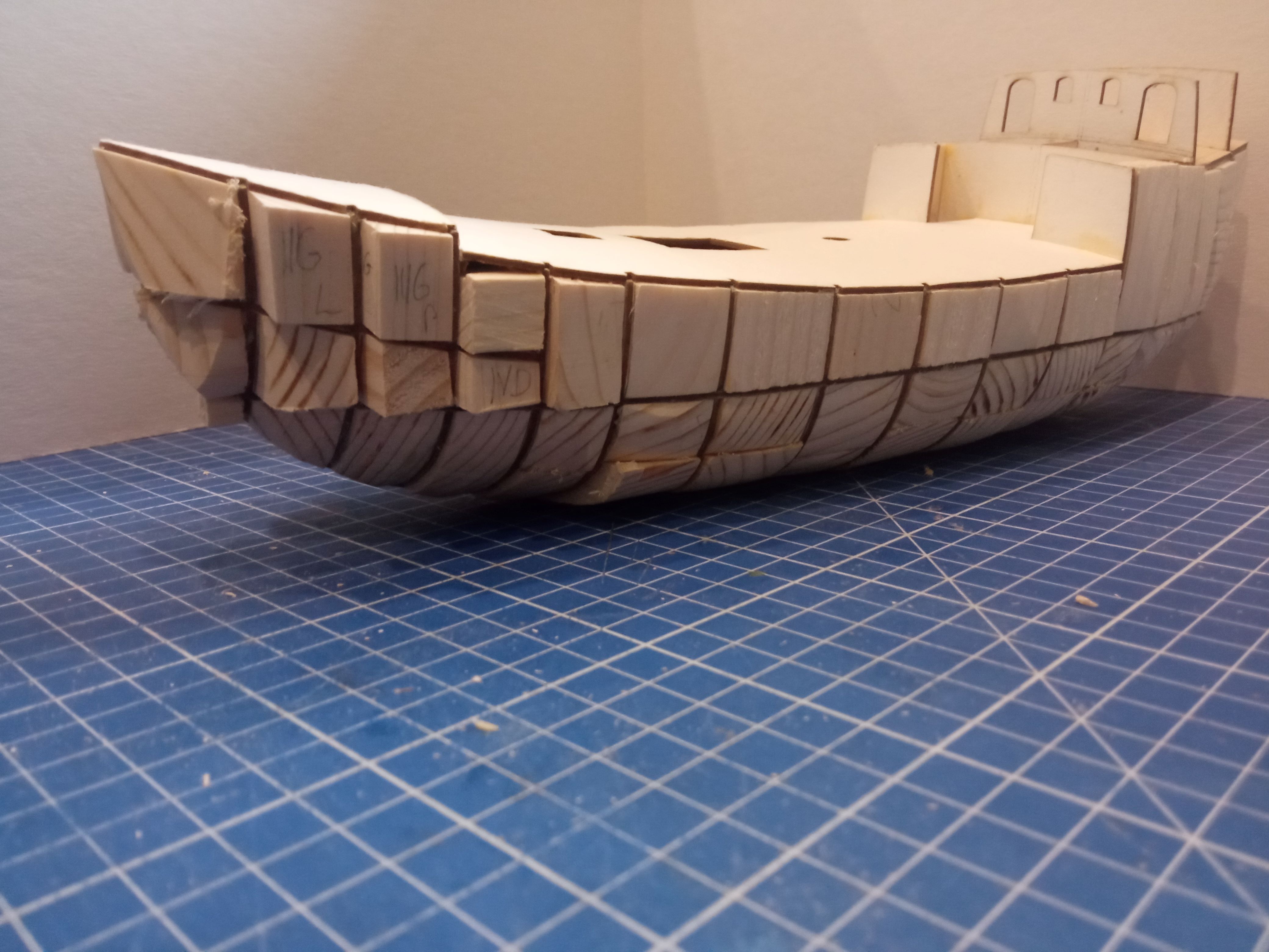 Wszystkie klocki wklejone - teraz "tylko" oszlifować. Sztywność kadłuba taka że można popaść w kompleksy