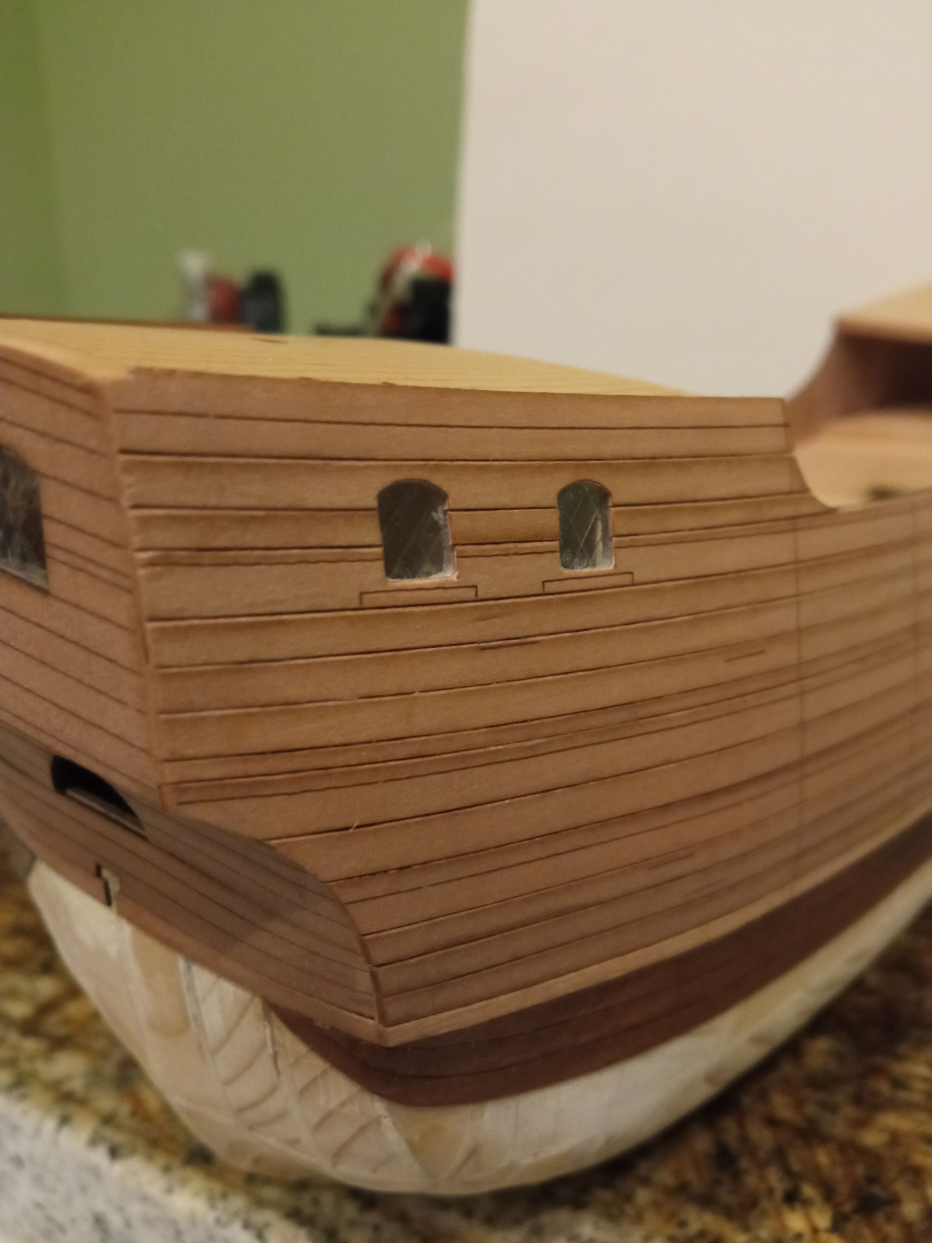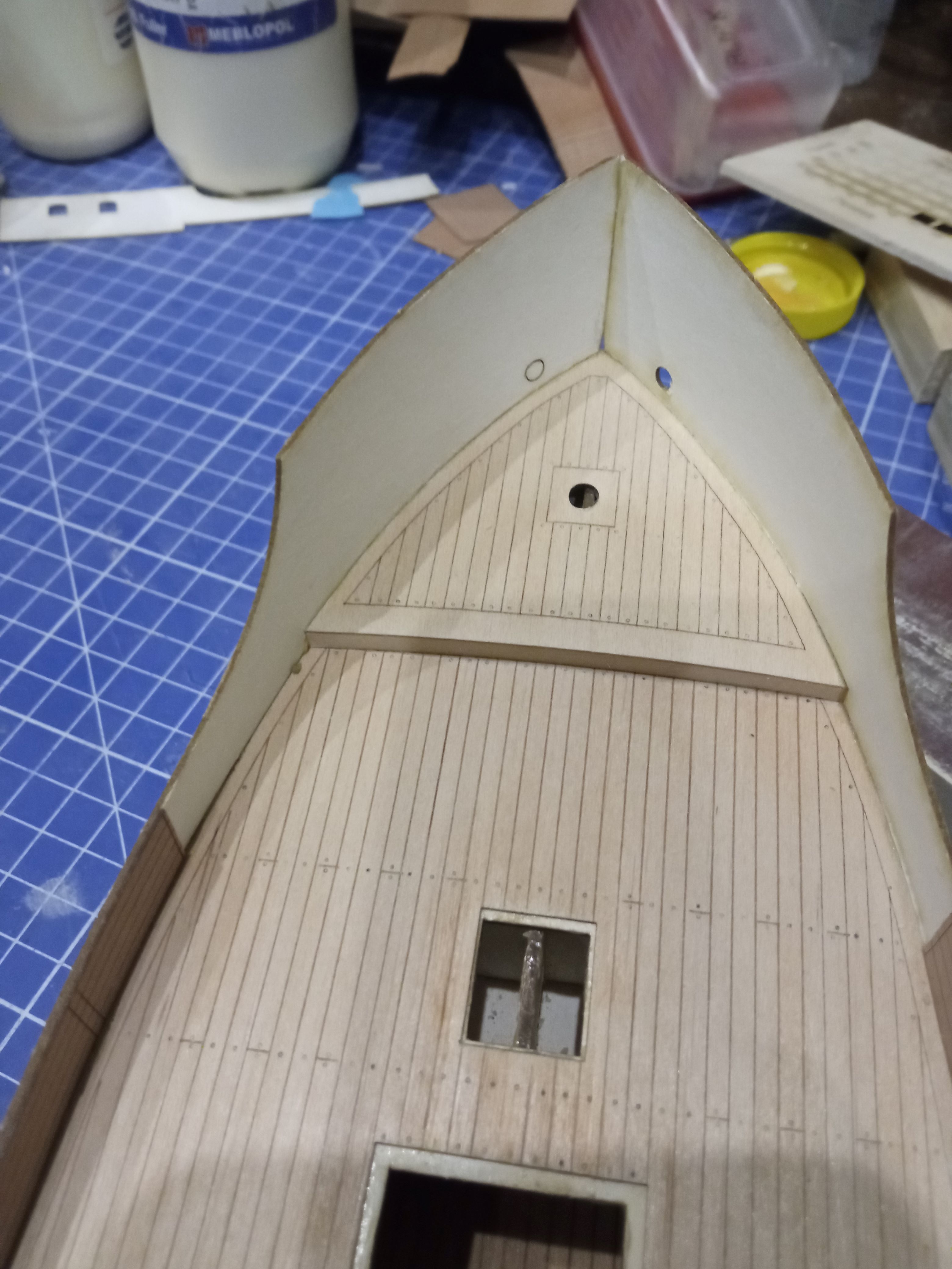 Korzystając z okazji przykleiłem pokład główny. Do dociśnięcia pokładu użyłem pociętych taśm elastycznych do ćwiczeń - bardzo fajnie się sprawdza - pociąłem na paski 3cm, dzięki temu uzyskałem ładny równomierny docisk (przy gumkach recepturach albo się wcinało w karton albo trzeba było kombinować z podkładkami) - taśma fajnie się dopasowuje i dociska.