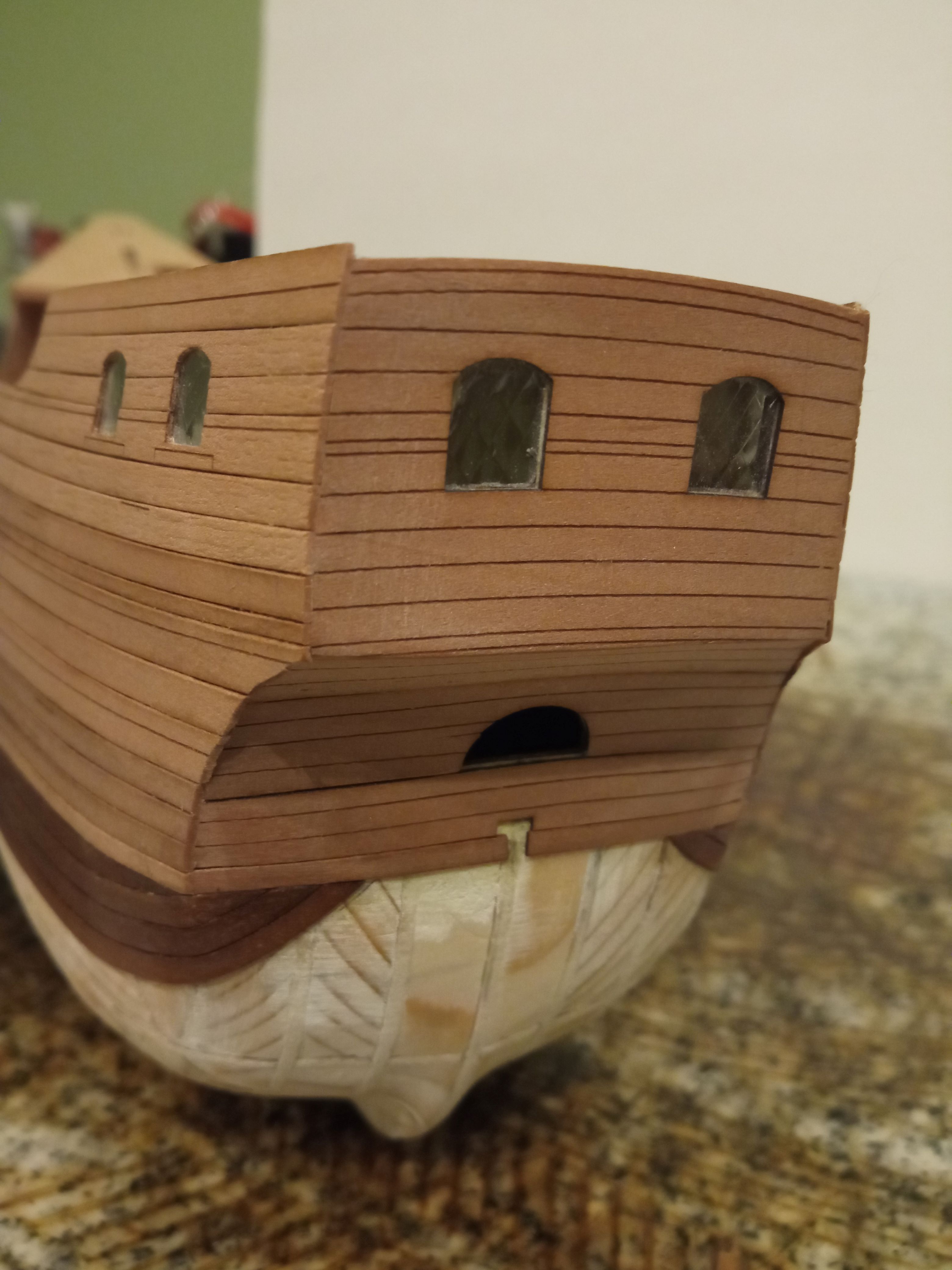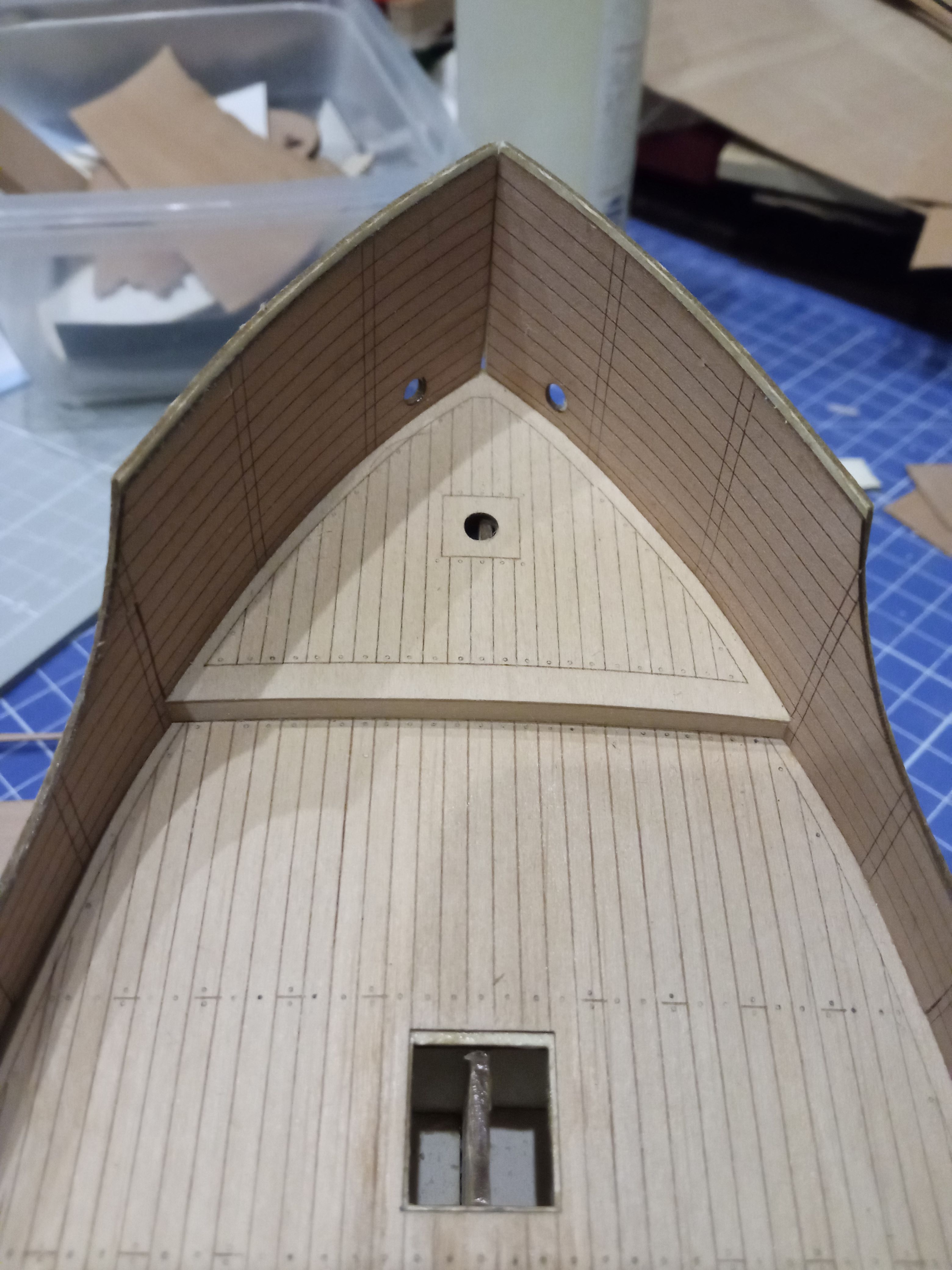 Dysponując ploterem laserowym miałem o tyle łatwiej że odtworzyłem strukturę wręg w CAD-ie i wyciąłem w kartonie 1,5mm, więc ze spasowaniem nie było żadnego problemu. Od razu wkleiłem pokład ładowni i ściany - drzwi to moja radosna twórczość. W tym przypadku trochę oszukiwałem - i pokład i ściany ładowni są wygrawerowane i wycięte laserem. Pokłady też tak wykonam - jedynie "trenails" zrobię igłą - to już mam przećwiczone na poprzednich projektach.