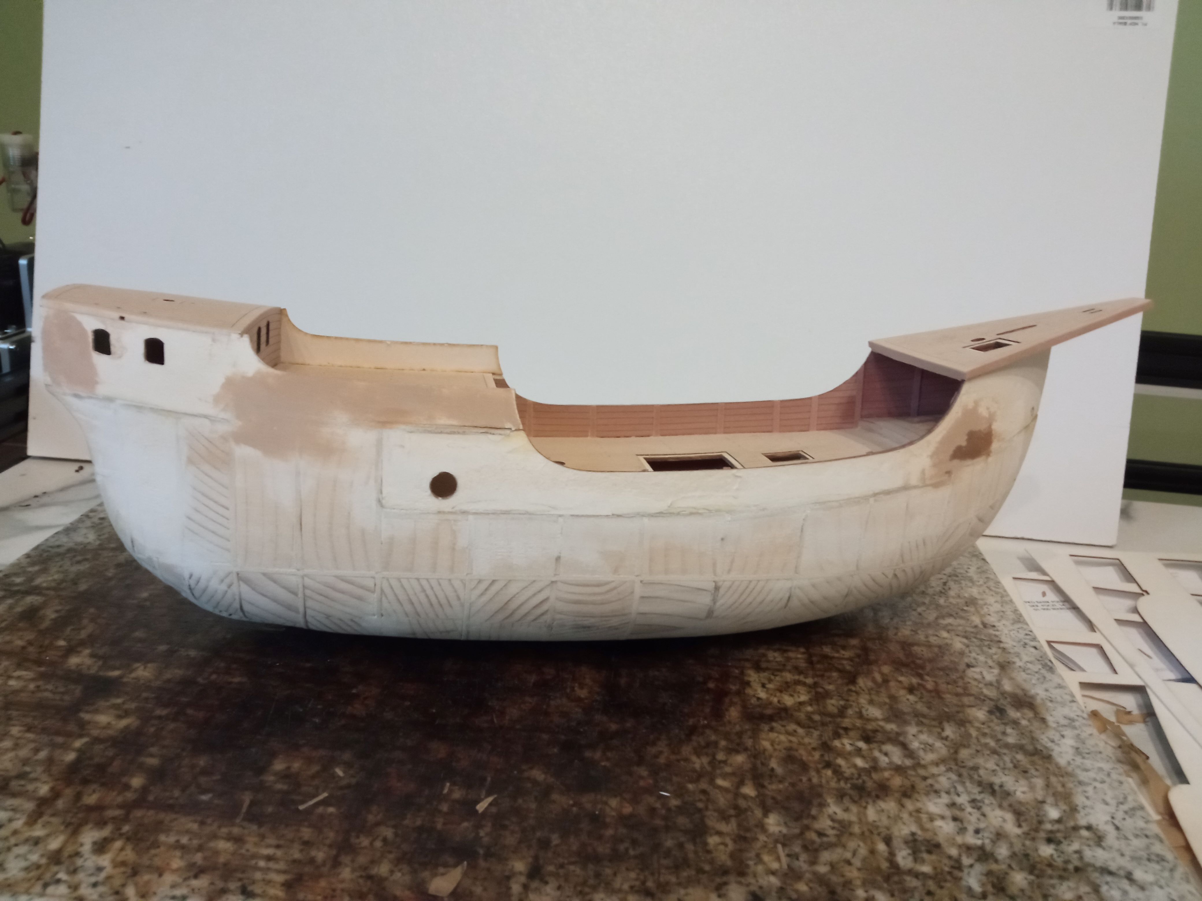 Między wręgi wkleiłem klocki świerkowe. Poprzednie modele próbowałem wypełniać pianką i szpachlą ale nie byłem zadowolony - pianka była dosyć miękka - nawet po szpachli (używałem akrylowej) a i sam kadłub nie był zbyt sztywny.