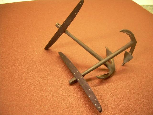 Dwa zdjęcia kotwic. Wykonane z mosiądzu i czernione patyna.