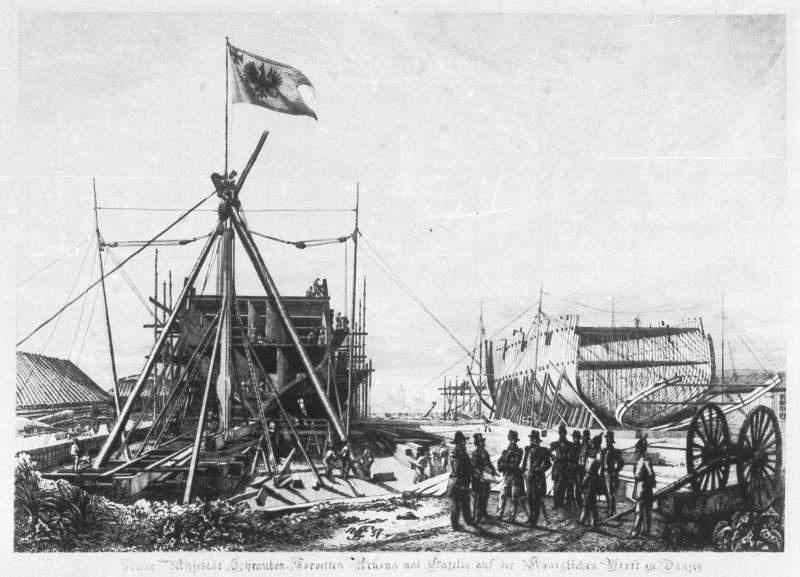 bandera nr 1 pochodzi z roku 1816 bandera nr 2 z 1871 do 1892. Korweta Elisabeth zwodowana została w 1869 i nie było by problemu gdyby nie pewne zdjęcie które wygrzebałem z zasobów internetu, przedstawiające budowę bliźniaczych jednostek Gazelle i Arkona i na tej rycinie widać banderę nr 1 a w planach jest bandera nr 2.