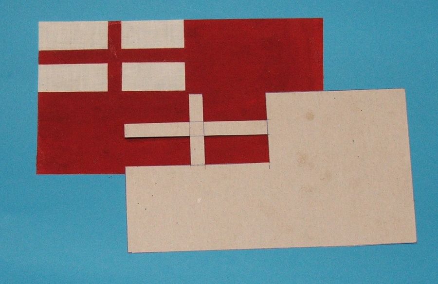 Jedna z flag wykonana metodą intarsji na szmacie.Prostokąty wycinane przez szablon jednocześnie biały i czerwony a potem wklejane klejem introligatorskim.Płótno też impregnowane tym klejem.Wycinałem oczywiście po jednym i wklejałem aby flaga nie traciła sztywności.Flaga jest spora to mogłem sobie pozwolić na taką metodę.R