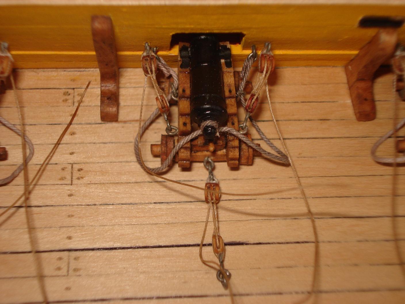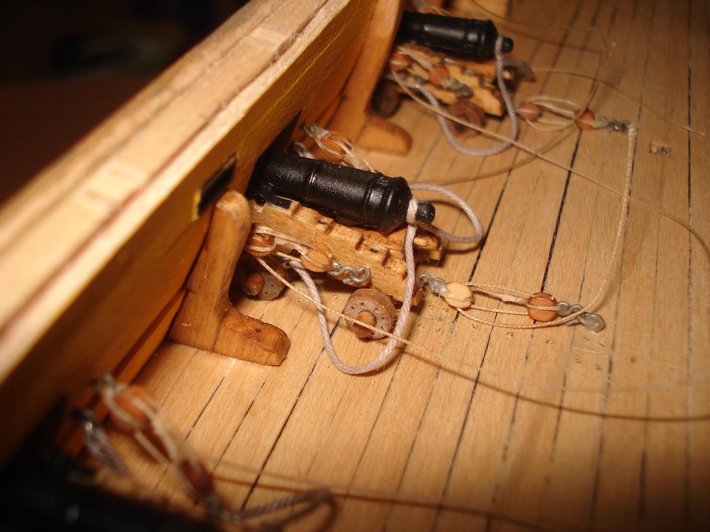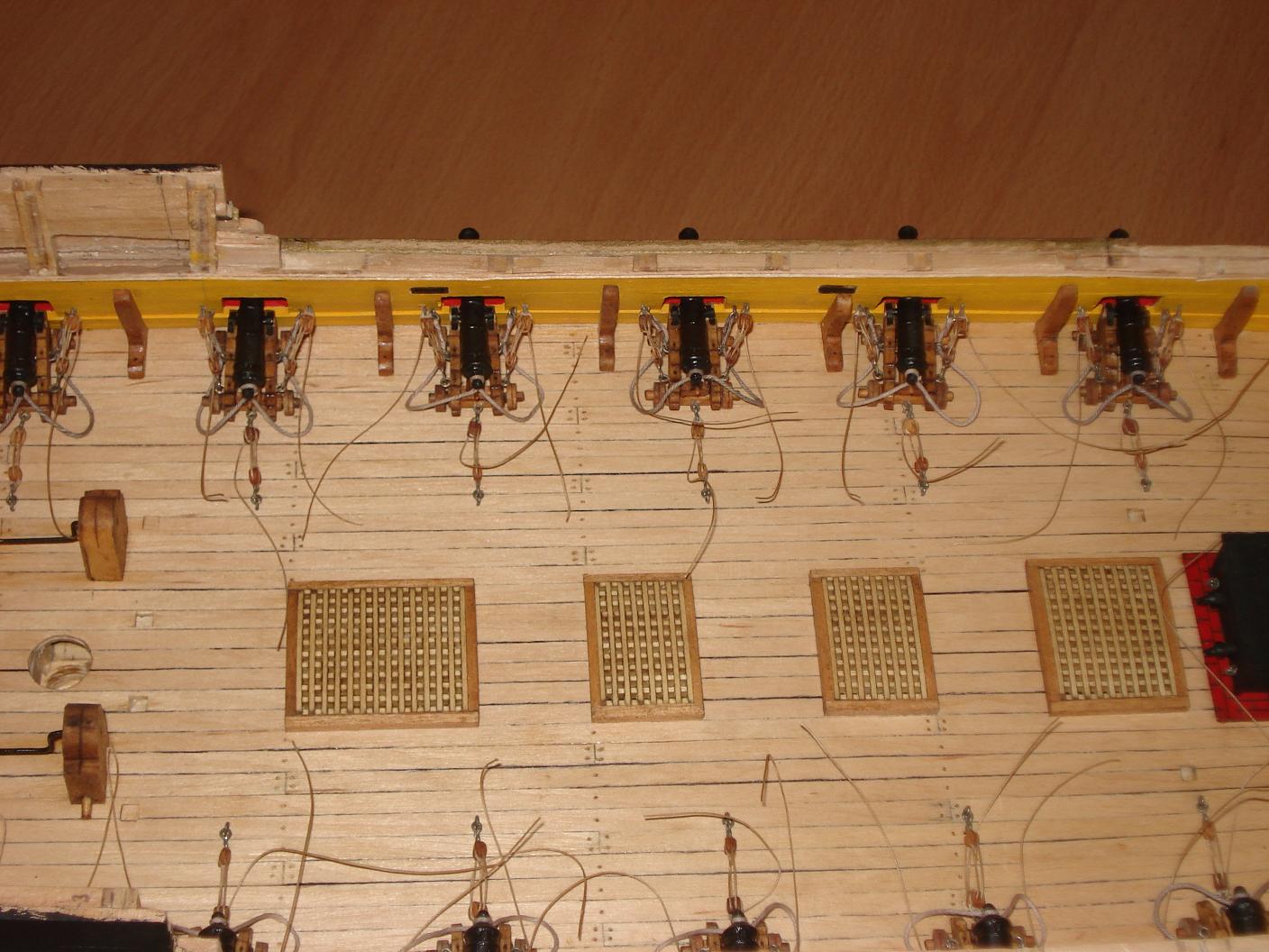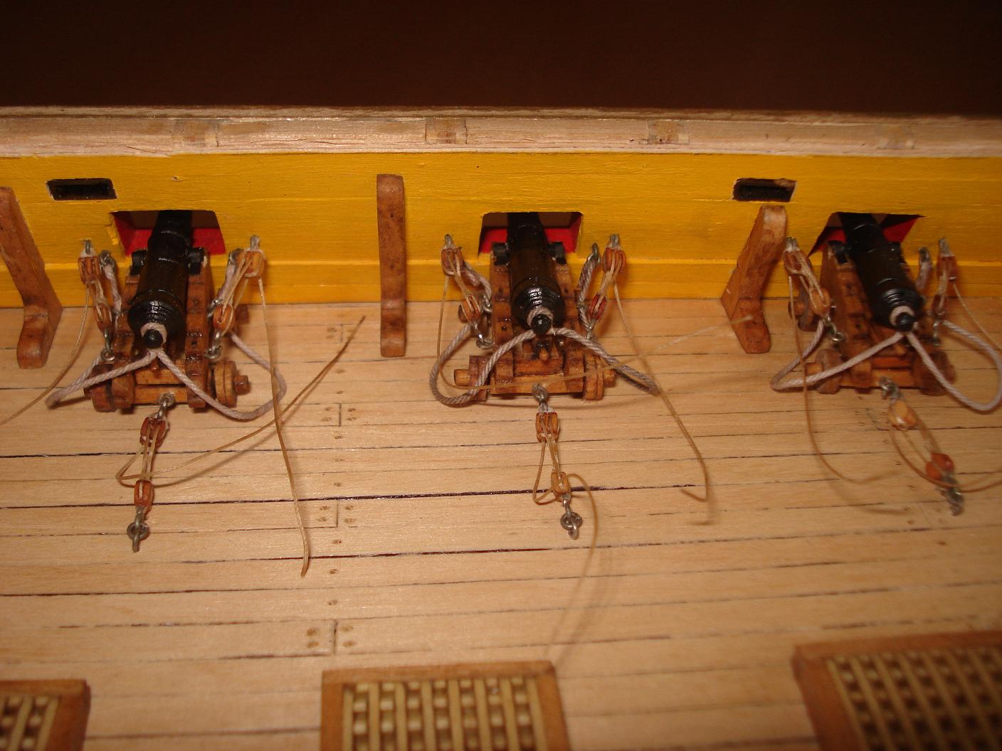 dolny pokład już uzbrojony, 12 widocznych armat w pełnym olinowaniu i na lawetach pozostałe osadzone na odpowiednich postumentach.