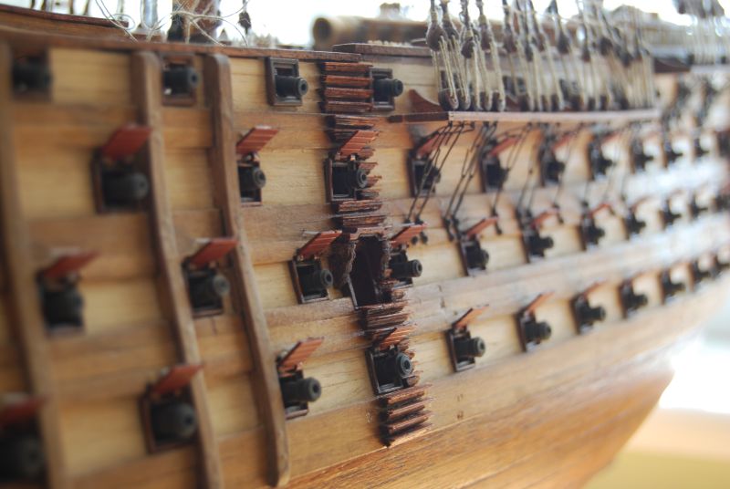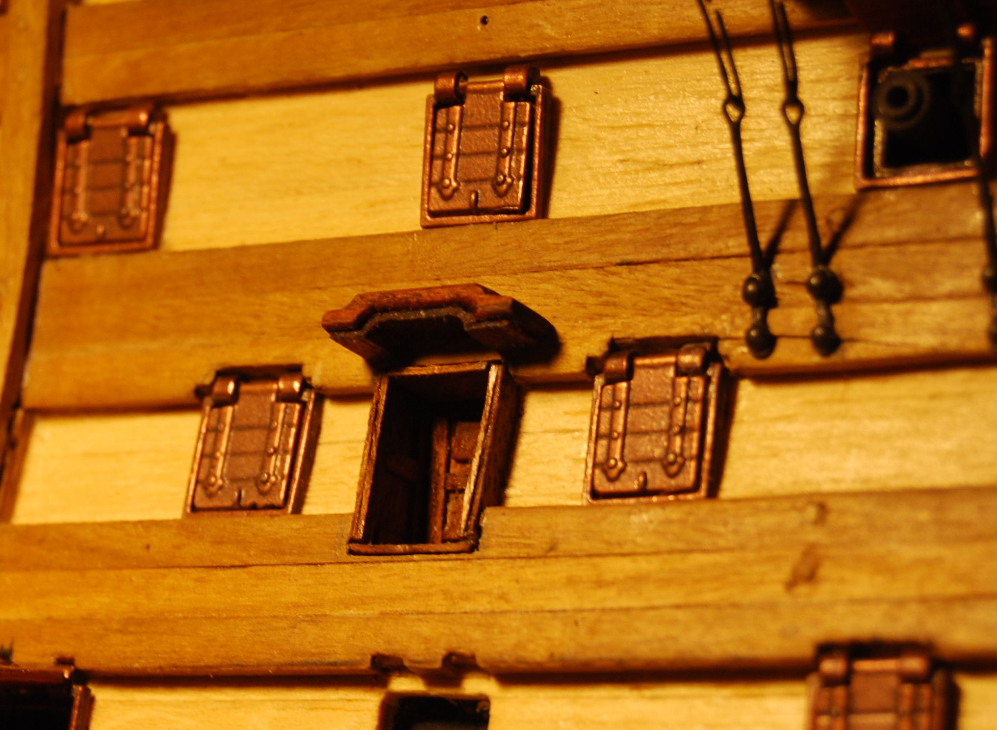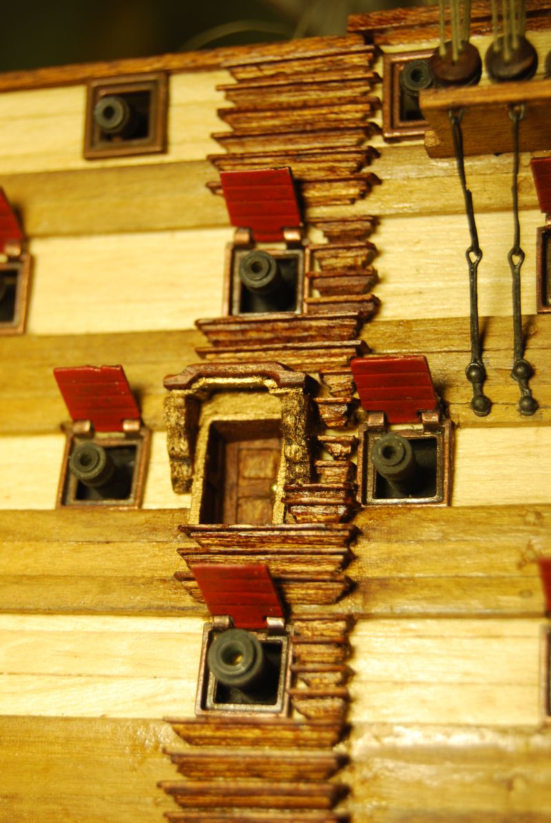 To nie jest sklejka tylko rzeźbione liście na tych podporach. Wymiary sobie przeskalowałem w stosunku do innych odniesień z rysunku jak na przykład odległości między armatami talrepami wielkość otworów strzelniczych. Wszystko wg mnie z wymiarami jest ok. Może po milimetrze na stronę się walnąłem i na wys. W skali to wielka różnica Tak czy inaczej już taki będzie. Najwyżej kapitan będzie musiał czapkę zdejmować. Na drugą stronę mam ścianki i daszek i wyśrupaną dziurę w burcie. Co do wielkości drzwi sugerowałem się tym żeby jeszcze się zmieściły mini stopnie pomiędzy furta a drzwiami.