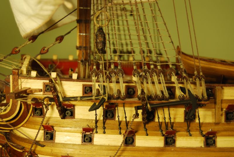 Uzbroiłem jedną burtę , wykonałem schody ( walnąłem jednej szerokości bo mi się nie podobały takie poskakane jak na Vitku ) i przeszwarcowałem lampy coby nie były jak z cepelii. Detale do mocowawnia rei oraz instrukcja jak to cholerstwo się wiąże. Te wyrwy przy kołkach to efekt pierwotnego wbicia gwoździ zgodnie z instrukcją, wszystkie podobijałem głęboko. Po wyciągnięciu ( a trzymały jak głupie , jak na złość ) i zapchaniu kołkiem wyszła taka lipa. To co zamulałem na klej gdzieś zniknęło. W normalnej wielkości prawie tego nie widać ( jednak jest - efekt braku wiedzy , ku przestrodze )