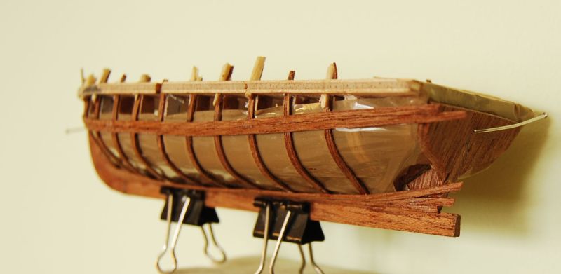 Pora na szalupy bo nic innego przy kadłubie nie zostało. Powiesić łańcuch przy sterze i siatkę na koszu dziobowym , i herb na rufie. Zacząłem robić Luncha co będzie zamontowany do Santismy w lini wodnej. Szkielet posłuży za formę. Nie mogę dojść do tego jakie ożaglowanie mu dać. Efektownie byłoby coś z bukszptytem na wzór Szalupy Santisimy wypuszczonej przez AL . Nie do końca to proponowane ożaglowanie jednak do mnie przemawia. Zmieniłem w dużej szalupie która robiłem na samym początku budowy układ ławek. Ciemniejsze ławki są zaolejowane. Z rozmachu i bez mózgu poleciałem. Jest więc różnica koloru werniks - olejowosk. Jaśniesze ławki były szlifowane ale już olejowosk nie penetruje jak powinien. Wyrwać ich się nie da bo za mocno trzymają. Będzie że ktoś grubym dupskiem połamał i trzeba było wymienić. Szkoda że nie dysponowałem olejowoskiem wcześniej. Całe odbojnice na kadłubie byłyby wyraźniejsze - ciemniejsze. Cóż . Człowiek się uczy. Pierwotne szalupy mi się nie podobają ale jak już są to pójdą na wyposażenie :-)