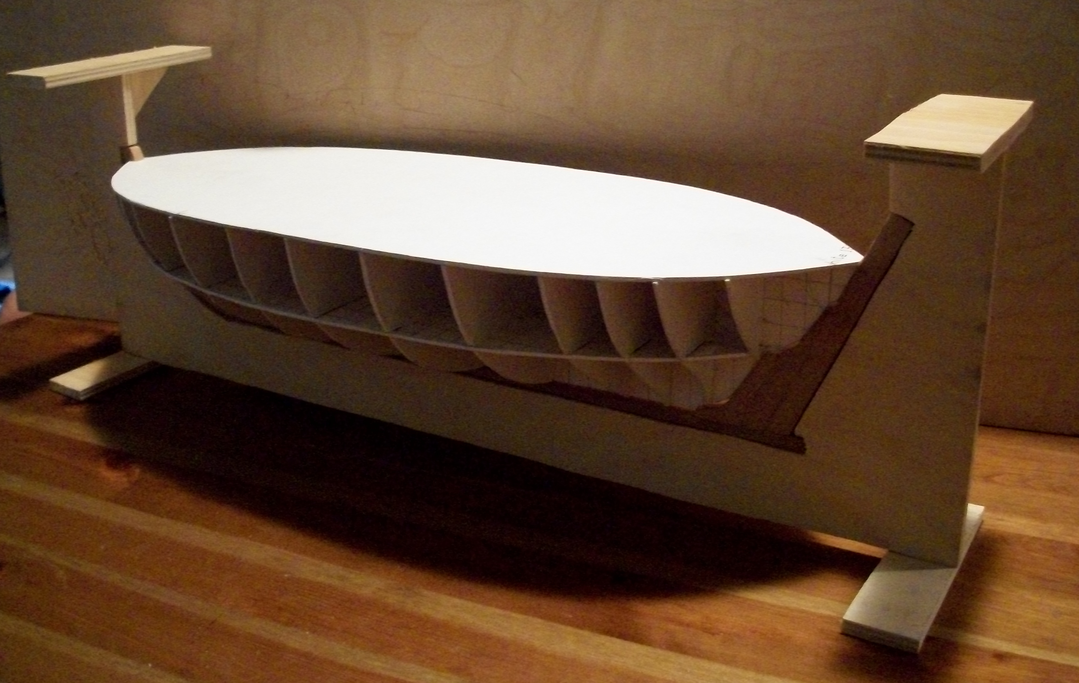 Aktualnie trzeba wyliczyć ilość belek wzmocnień poprzecznych, ilość żeber, ilość rzędów planek tak, aby wszystko się złożyło. A to rysunki i matematyka. Nie da się robić modelu nie posiadając kompletnej koncepcji lub stworzonych planów - bo co wtedy mam robić?
