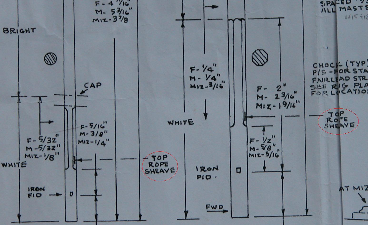 2. drugi dotyczy ukazanych na planach (zarówno tych modelarskich firmy Model Shipways, jak i w Anatomy of the ship) rolek umiejscowionych w okolicy pięty steng poszczególnych masztów. Rolka jak rolka, można ją bez problemu umieścić we wskazanym miejscu, ale pomimo dokładnych poszukiwań nie udało mi się zidentyfikować liny, która po niej idzie. Na planach widnieje określenie: „top rope sheave”. Pierwszy raz spotykam się z nazwą „top rope”. Co to za lina i którędy jest ona prowadzona???