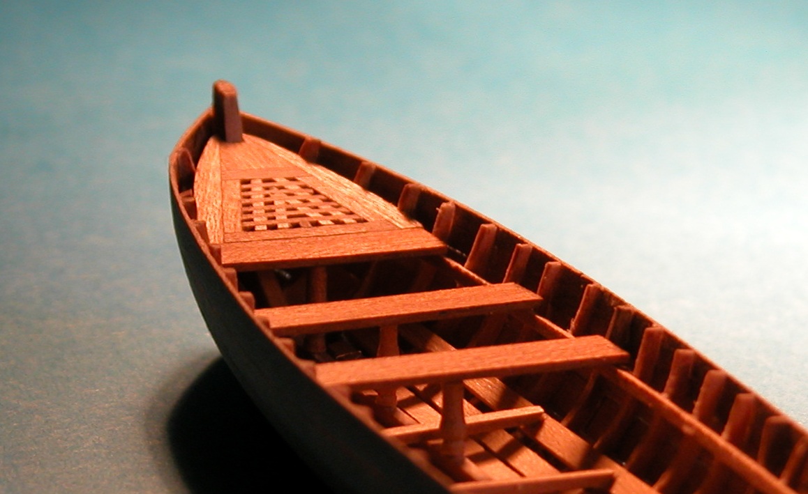 Trwa wykańczanie wnętrza. Wkleiłem podłogę w części przeznaczonej dla załogi, podłogę w części „kapitańskiej”, fordeck i częściowo ławki dla wioślarzy. Najmocniej namordowałem się z fordeckiem i podłogą „kapitańską” (w części rufowej), a to z powodu umieszczonych tam gretingów. Mało, że ich oczka to zaledwie 0,5 mm, to jeszcze listwy nie biegną pod kątem prostym. Ale jakoś się udało: