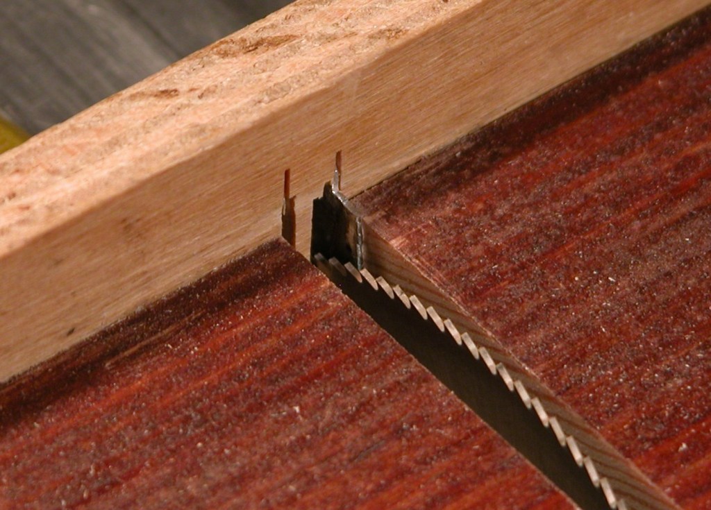 Materiał jaki stosowałem to grusza (wybrałem taką o ciemniejszym odcieniu – dlaczego to już w głównej relacji). Przy pomocy takiego oto „przyrządu” nacinałem rowki w deseczkach o grub. 2 mm, głębokość nacięć ok. 1 mm (powinno być nawet trochę mniej – im głębsze rowki tym łatwiej o wyszczerbienie zębów):