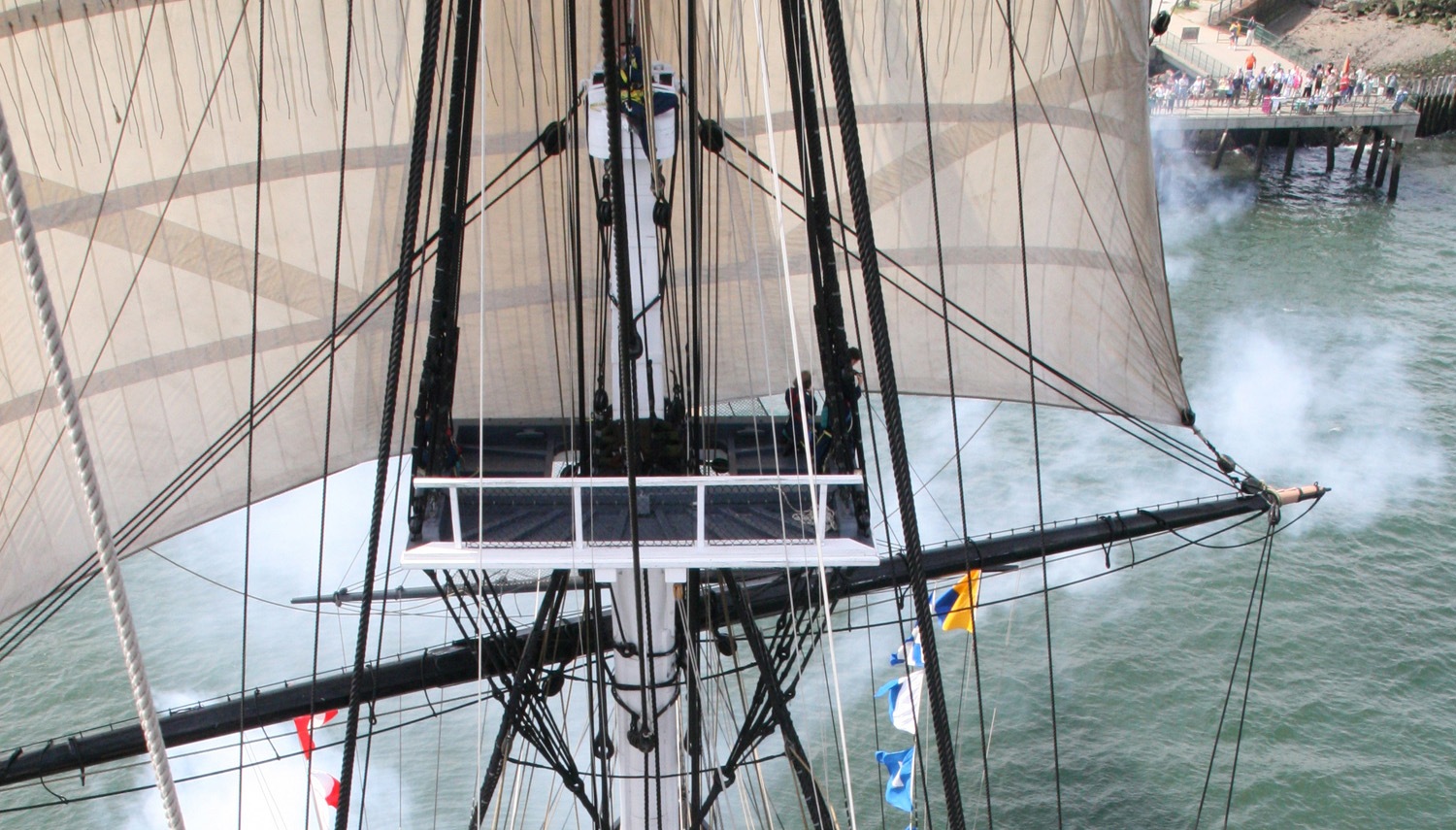 3. omawiane szwy tworzą po prawej stronie żagla rodzaj „obramówki”, której przecież de facto nie było. Dla ilustracji załączam foto rozwiniętego fokmarsla z Constitution, na którym zakład i owszem jest widoczny, ale bez żadnych szwów.