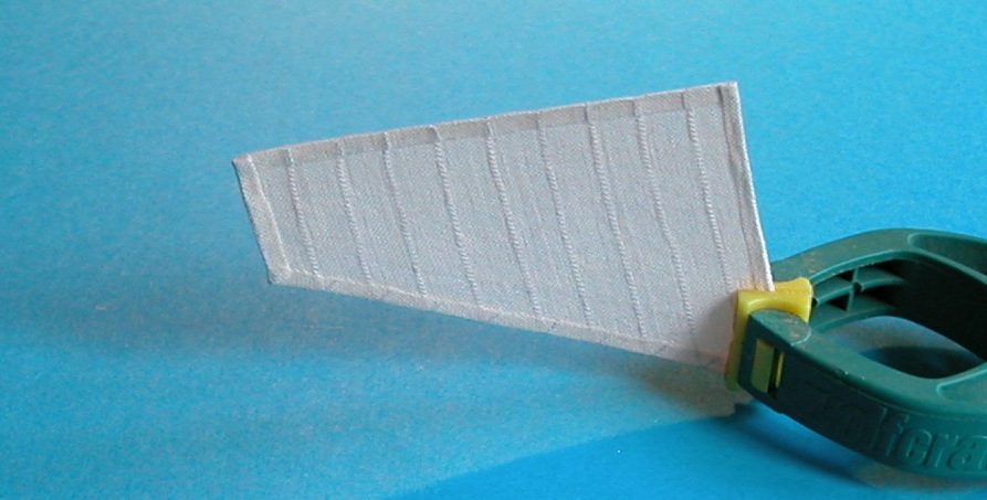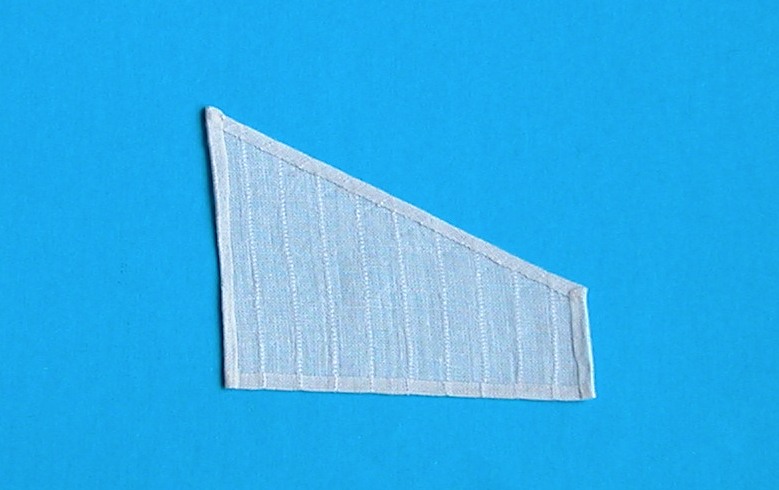 Ponieważ założyłem, że tylko część żagli będzie rozwinięta, a w tych zwiniętych i tak nic nie będzie widać, postanowiłem wypróbować inną metodę – zaprasowałem brzegi płótna do żądanego kształtu (pamiętajmy, że jest ono porządnie nakrochmalone, więc doskonale „trzymało” zadany kształt), przyciąłem nadmiar materiału do wspomnianych wcześniej 3 mm (krochmal zapobiegł siepaniu się brzegów) i stosując bardzo niewielkie ilości rozrzedzonego wikolu po prostu skleiłem zakładki. Poniżej efekt z prawej i lewej strony.