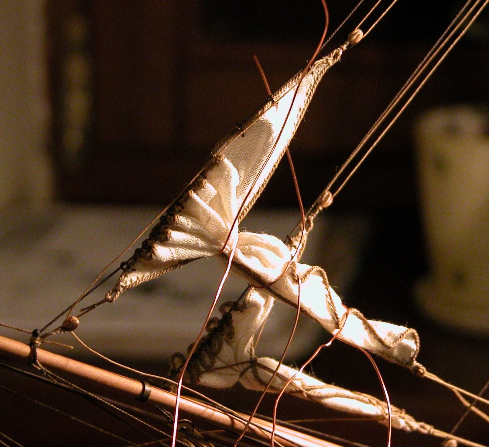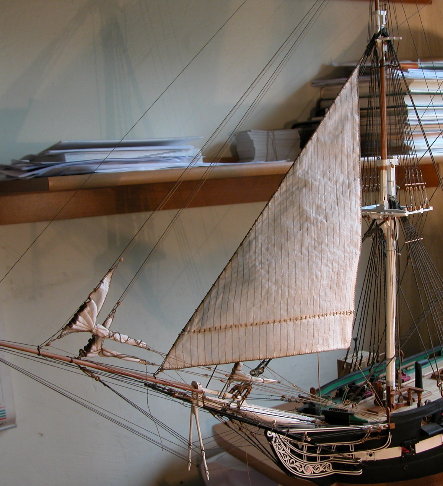 I można było przejść do stawiania żagli. Na początek zmarlowane: sztafok, bomkliwer i latacz. Zapomniałem wspomnieć o tym wcześniej, ale zgodnie z radą Adama i wskazówkami w literaturze, żagle zaplanowane jako zmarlowane, przygotowane zostały mniejsze (okrojone) w stosunku do właściwych wymiarów (aby uniknąć nadmiernych „brzuchów” po zmarlowaniu). Niestety nie mogłem zastosować metody opisanej przez Adama (polegającej na wcześniejszym przygotowaniu „kokonów”, czyli zmarlowanych sztaksli i powieszeniu ich na gotowo). Musiałem wszystko, krok po kroku, robić na modelu.