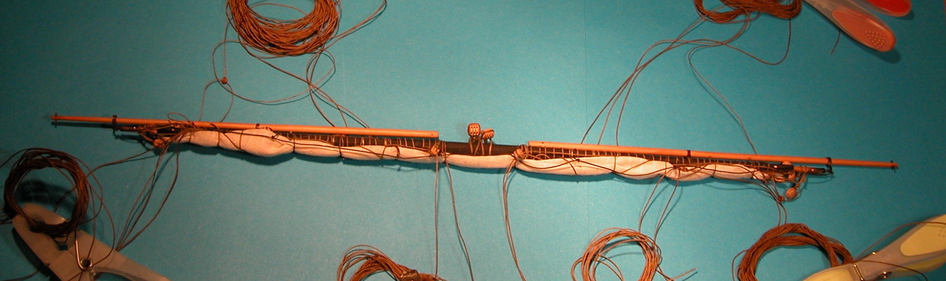 Chwilowe zaćmienie umysłu (a może pomroczność jasna) spowodowało, że pierwotnie fokmarsreję powiesiłem w górnym położeniu (jakby żagiel był rozpięty) i zanim zauważyłem błąd, zdążyłem obłożyć wszystkie liny i obciąć ich nadmiar. W rezultacie musiałem wszystkie wymienić (poza gejdawami, które wystarczyło skrócić). Ale jest już OK. Szoty, kontraszoty, brasy i buliny czekają na obłożenie aż skończę cały fokmaszt, gdyż teraz blokowałyby i tak bardzo utrudniony dostęp do miejsc obłożenia kolejnych linek.