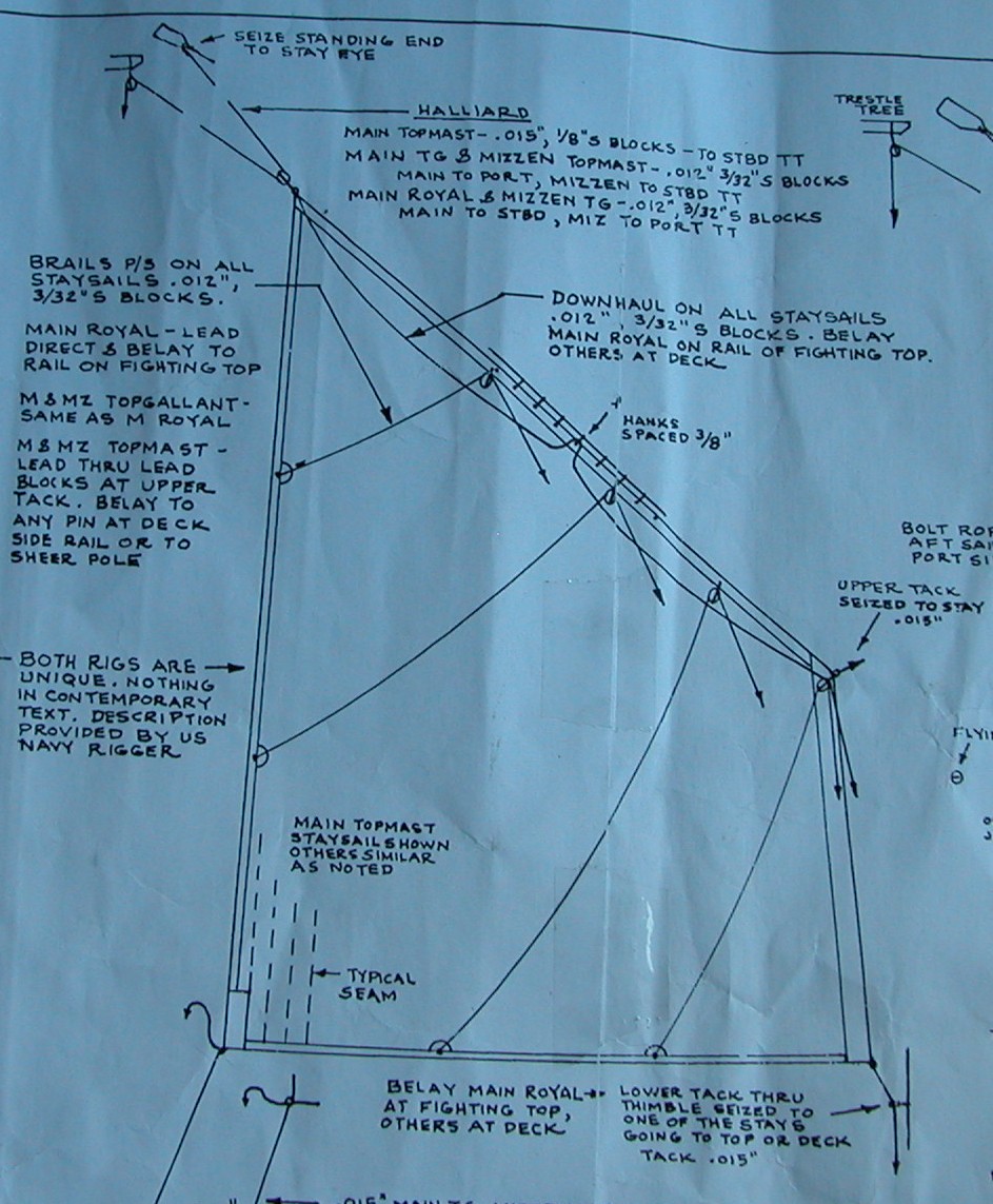 W czasie budowy opieram się na planach MODEL SHIPWAYS . W opisie budowy dołączonym do tychże czytamy: „Constitution has wooden hanks to bend (secure) the head sails to their stays. For the model, use brass split rings.”, zaś na planach wyrysowano takie coś: