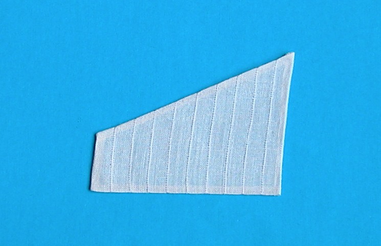 W międzyczasie próbowałem coś dziergać ze szmatkami. Z cieniutkiego batystu wyciąłem z odpowiednim naddatkiem poszczególne żagielki. Delikatnie je zafarbowałem, a następnie porządnie wykrochmaliłem i wyprasowałem. Uzyskałem dzięki temu sztywne kawałki płótna, które dość łatwo było przeszyć uzyskując imitację brytów.