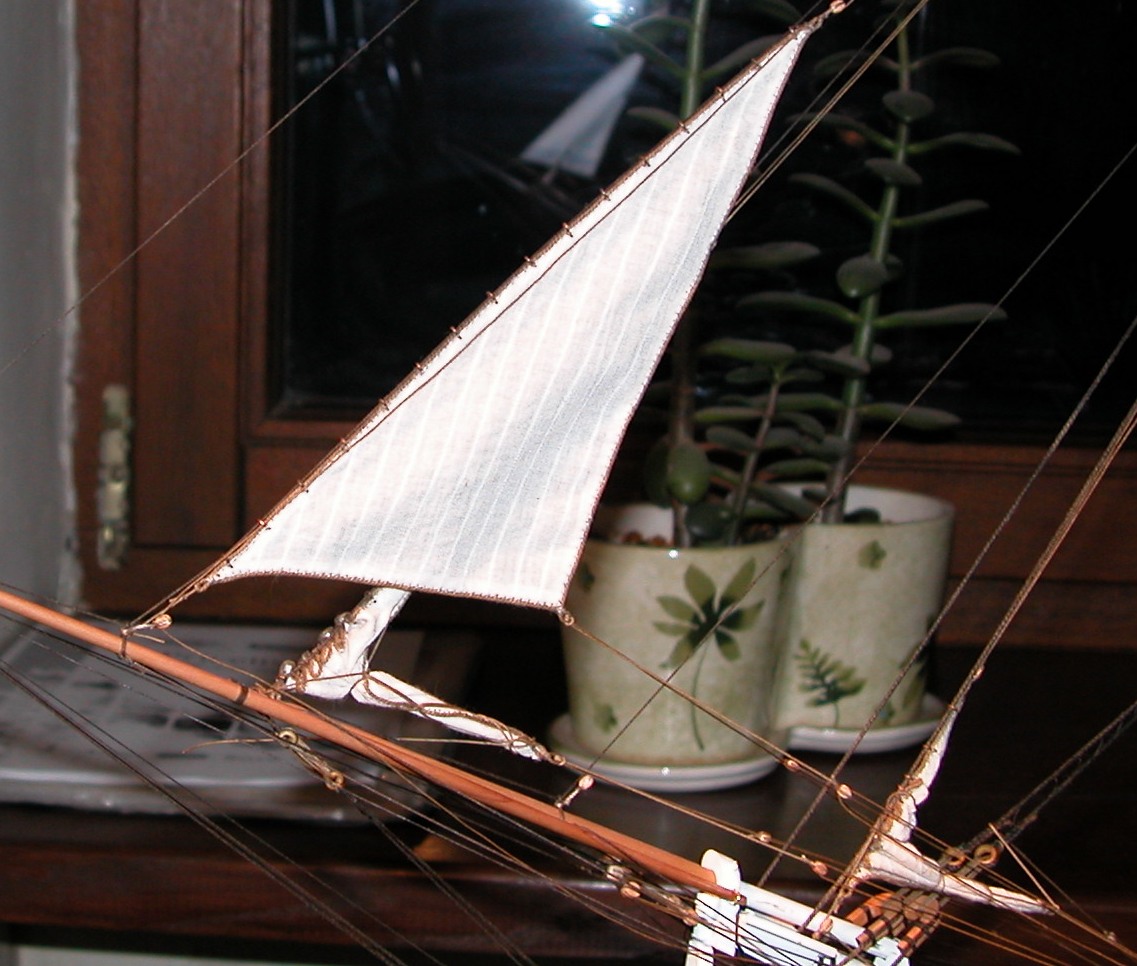 I można było przejść do stawiania żagli. Na początek zmarlowane: sztafok, bomkliwer i latacz. Zapomniałem wspomnieć o tym wcześniej, ale zgodnie z radą Adama i wskazówkami w literaturze, żagle zaplanowane jako zmarlowane, przygotowane zostały mniejsze (okrojone) w stosunku do właściwych wymiarów (aby uniknąć nadmiernych „brzuchów” po zmarlowaniu). Niestety nie mogłem zastosować metody opisanej przez Adama (polegającej na wcześniejszym przygotowaniu „kokonów”, czyli zmarlowanych sztaksli i powieszeniu ich na gotowo). Musiałem wszystko, krok po kroku, robić na modelu.