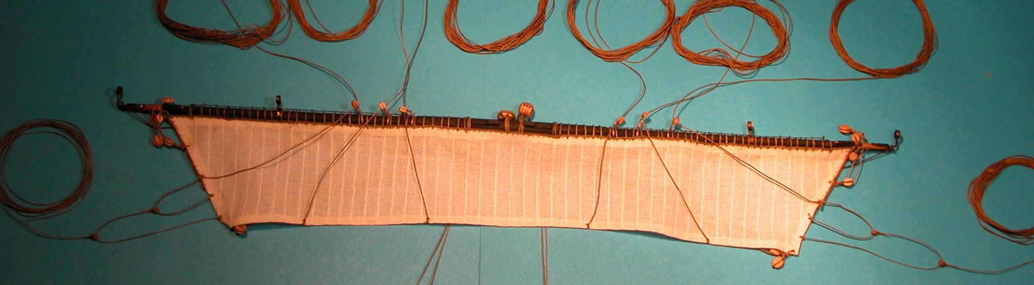 Aby usunac zagiel z poszczegolnych "hanks", odpinano go z owych hanksow, przesuwajac te drewniane toggle (koleczki) przez petle linki - jak na ilustracji - tu pozycja odpieta.